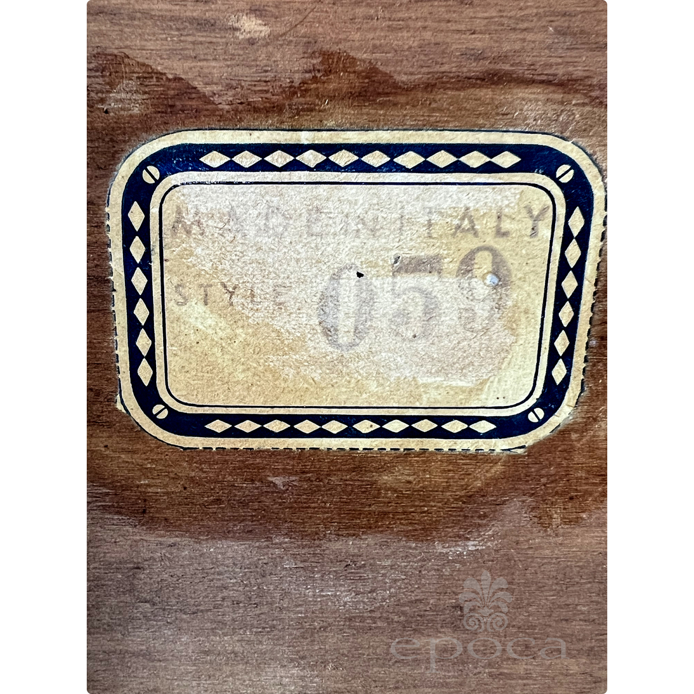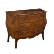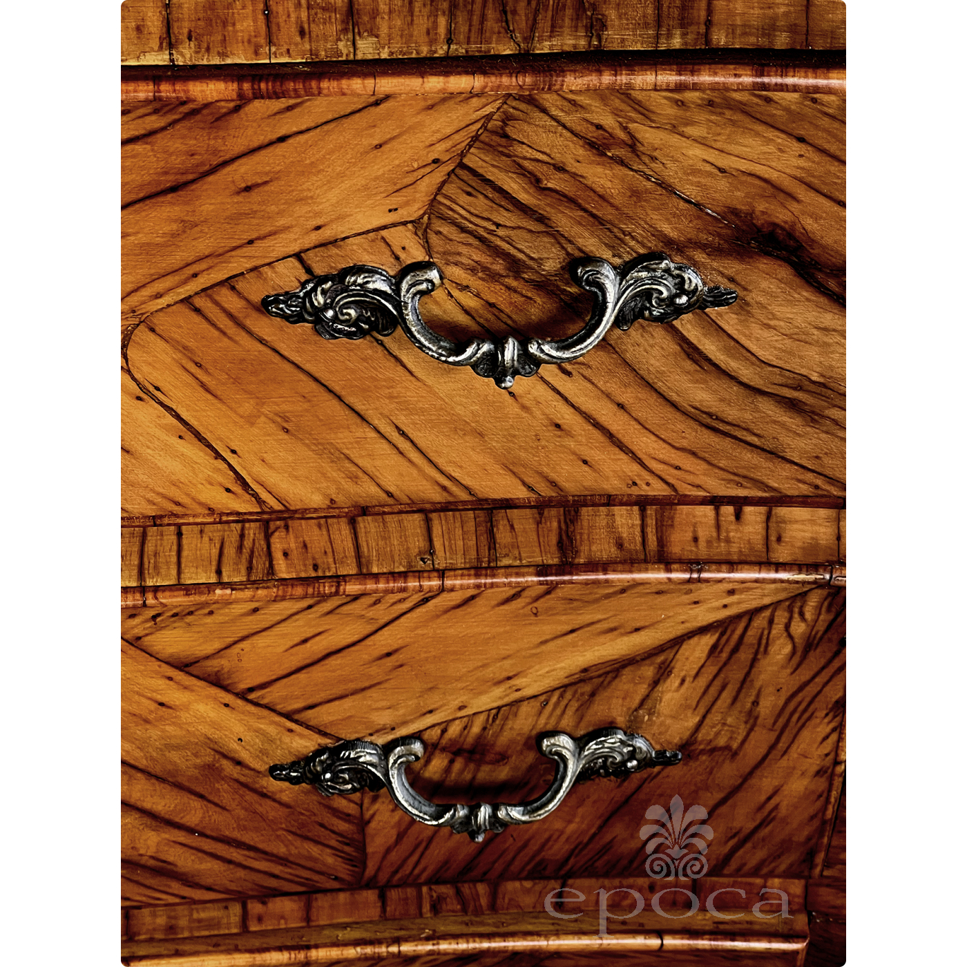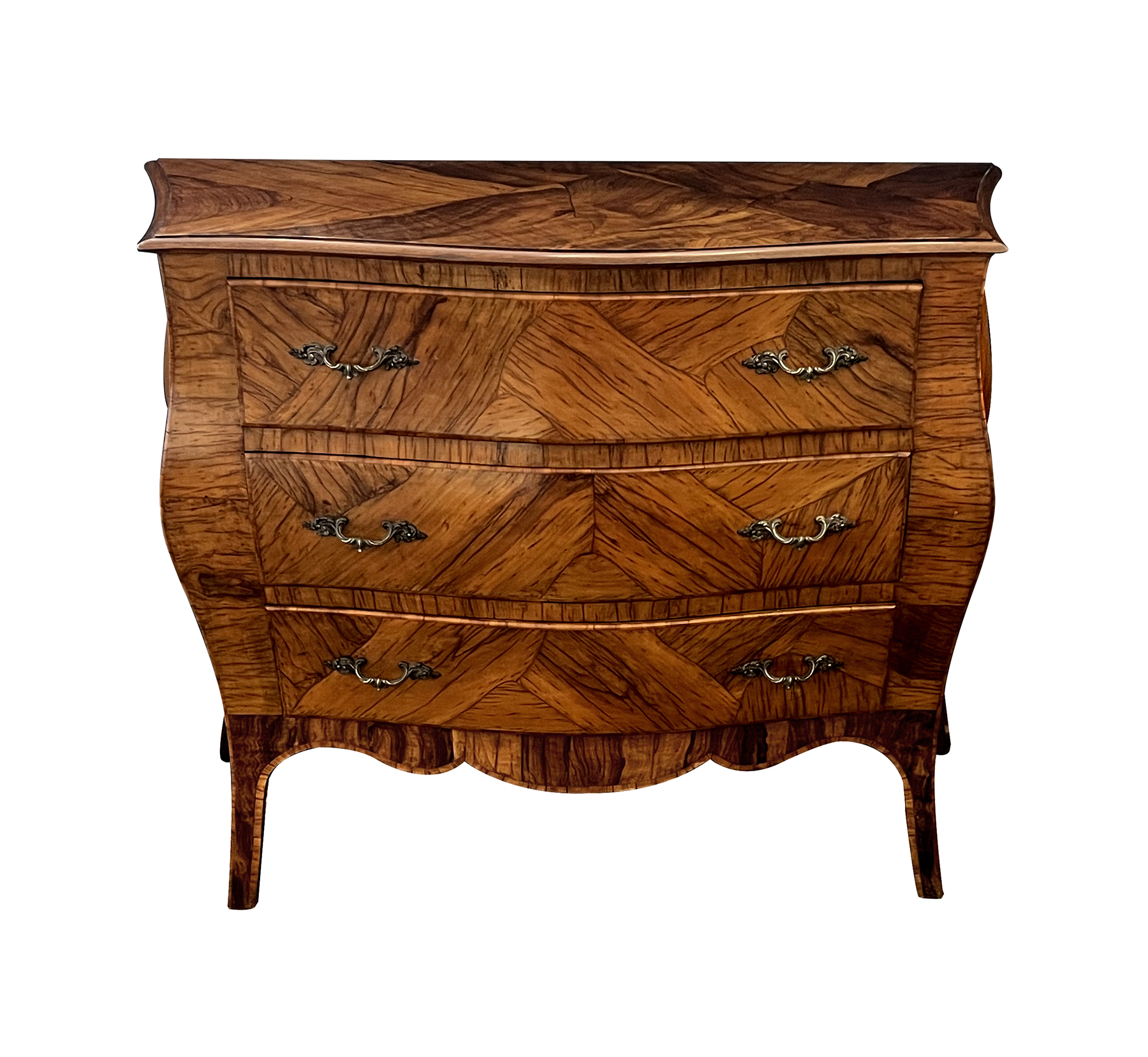 the mid-century chest in the rococo taste having a shaped top above a conforming bombé-form case with three drawers featuring ornate bronze pulls; over a scalloped apron all raised on splayed supports; the whole in a well-figured and richly patinated olivewood veneer; 'Made in Italy' label affixed to back; good vintage condition; professionally refinished