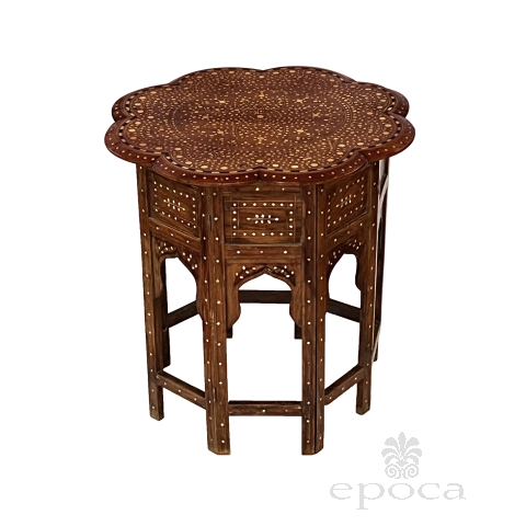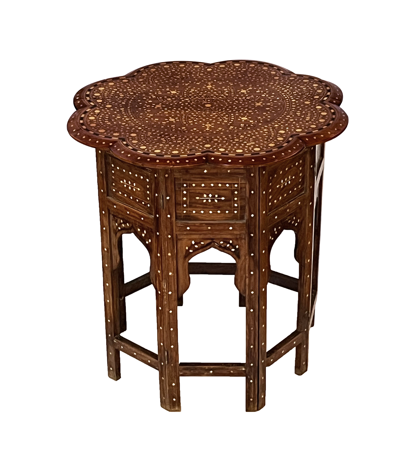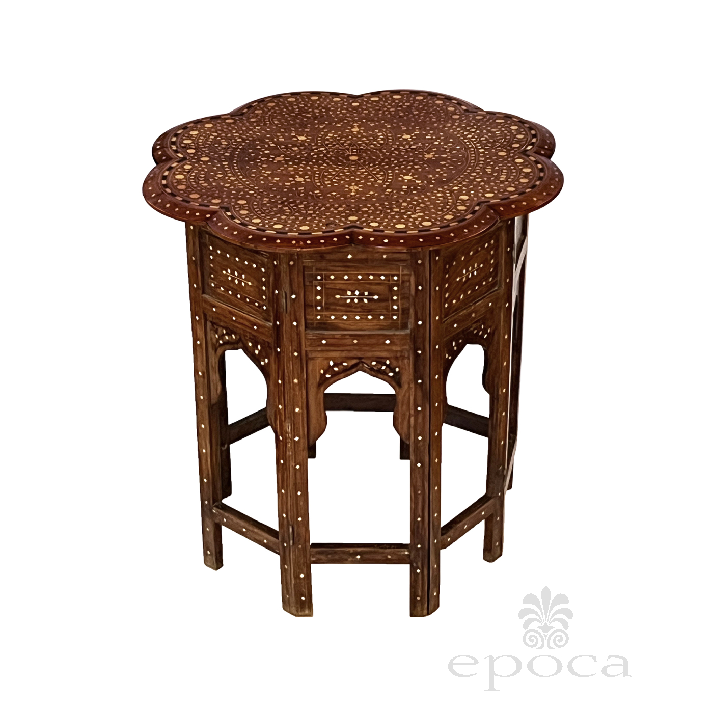originally used as traveling tea tables for the British in India; the scalloped top of rare form centering a large stylized floral medallion surrounded geometric patterns; raised on a hinged base with arabesque spandrels; good antique condition with overall warm patina; small replacements to inlay; top now affixed to base