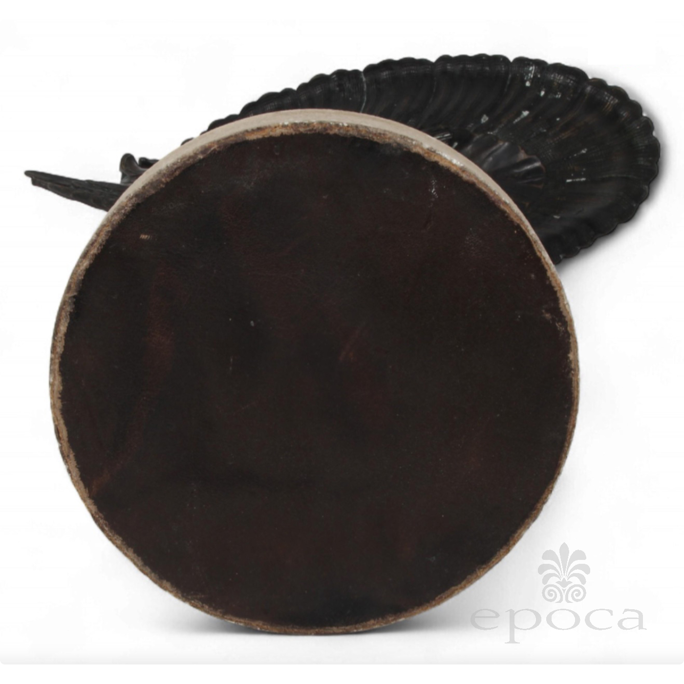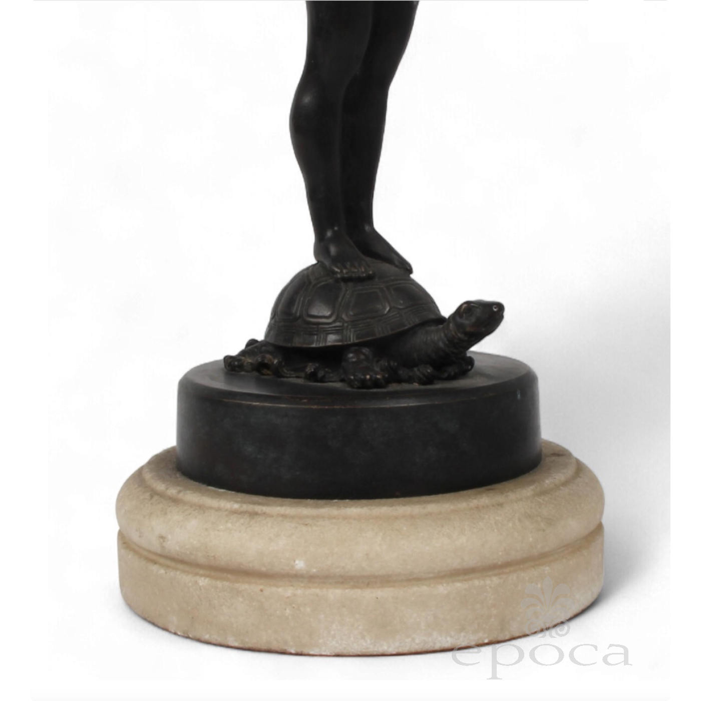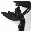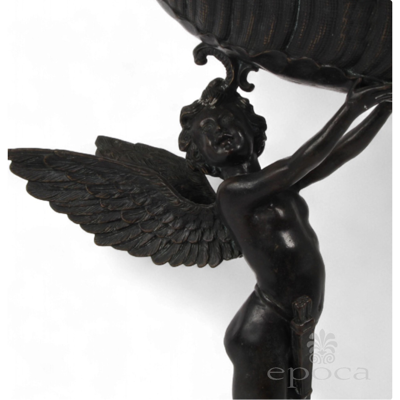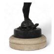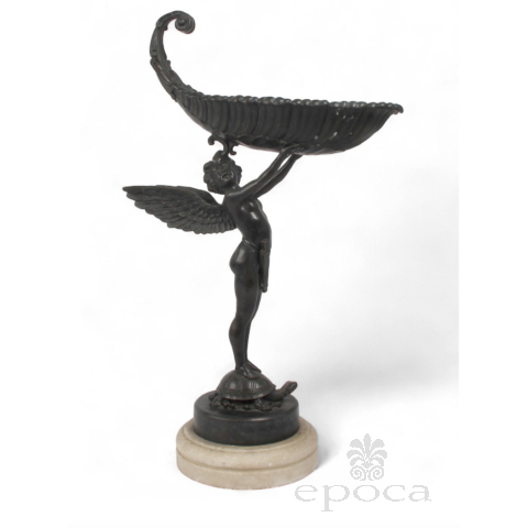 antique neoclassical figural sculpture in cast in bronze depicting a winged cupid with arrows and quiver raising a well-delineated leaf-form vessel while standing on a turtle pedestal; beautiful craftsmanship and detailing; unknown artist with no noticeable signature or maker's mark; modeled after Franz Von Stuck (German 1863-1928) Nautilus Cup; good antique condition with overall even wear and warm patina