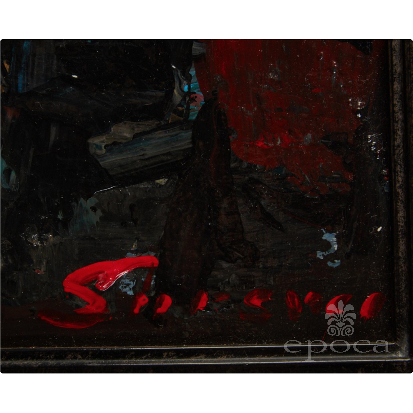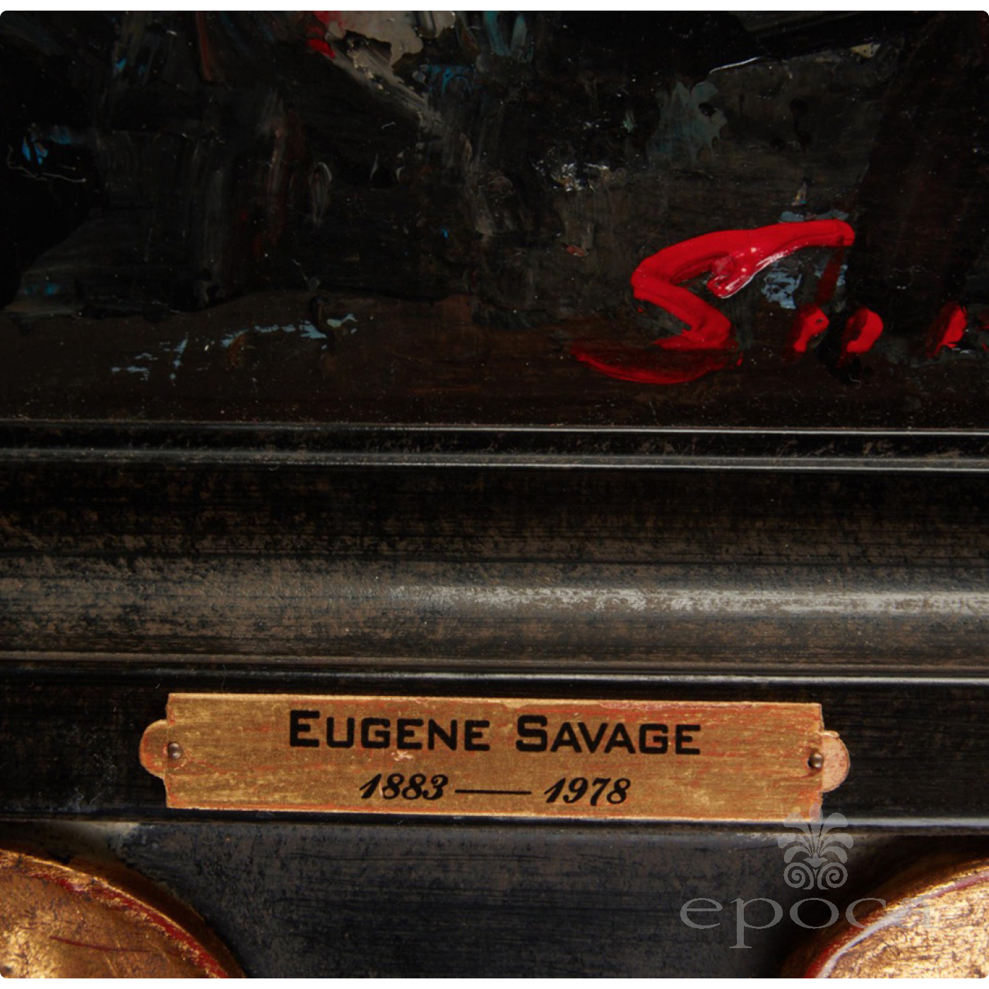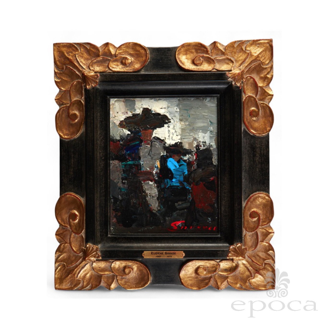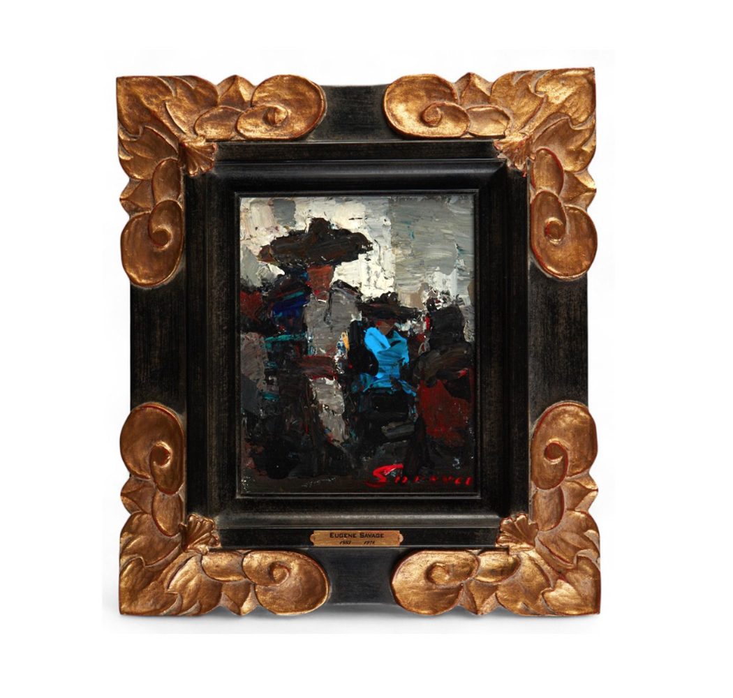 a fine example of post-war abstract expressionism with its emotional and spontaneous thick impasto paint strokes conveying a deep feeling rather than realistic images; signed lower right 'Savage'; Property from the Collection of Lorna and Milton Berle, Beverly Hills, California; dimensions: 9.5" x 7.5" (sight), 17.5" x 15.5" (frame); with later custom ebonized and giltwood frame; good condition with clean surface
