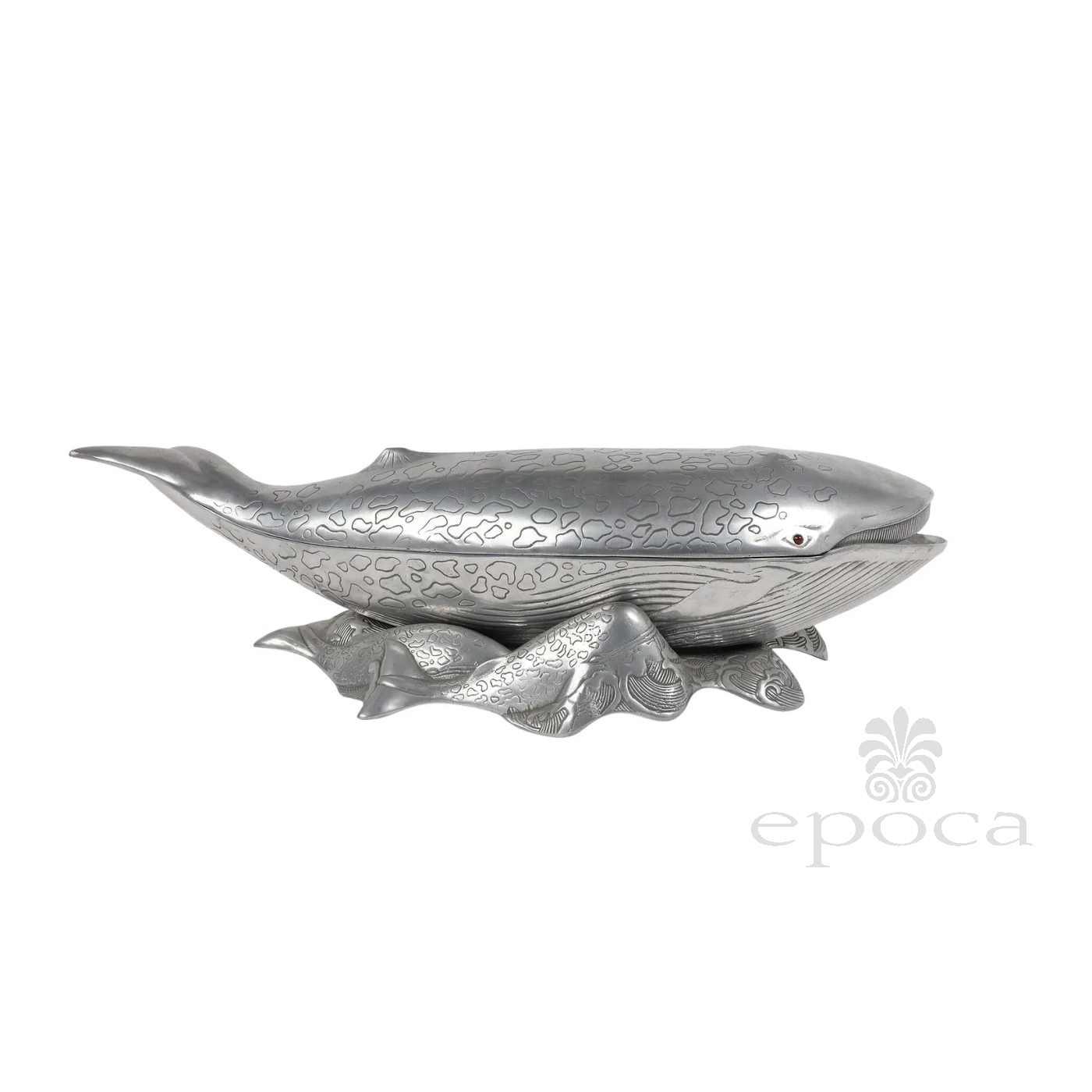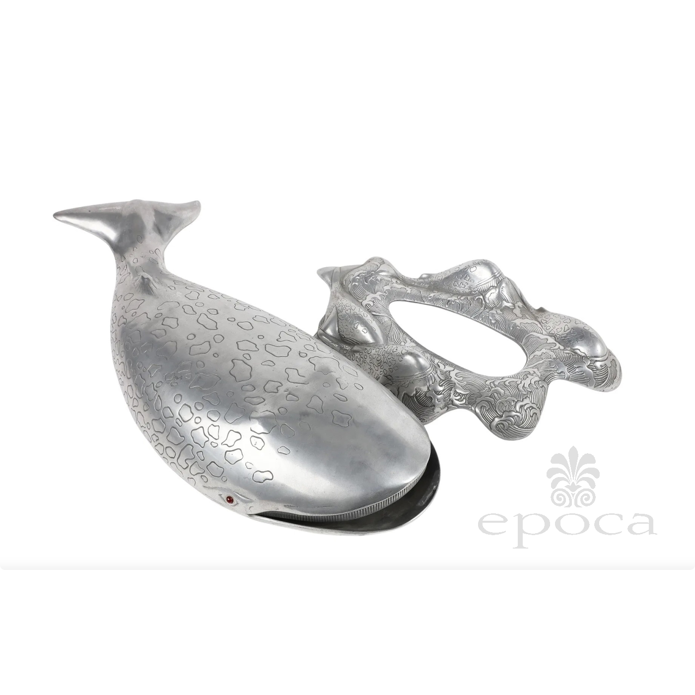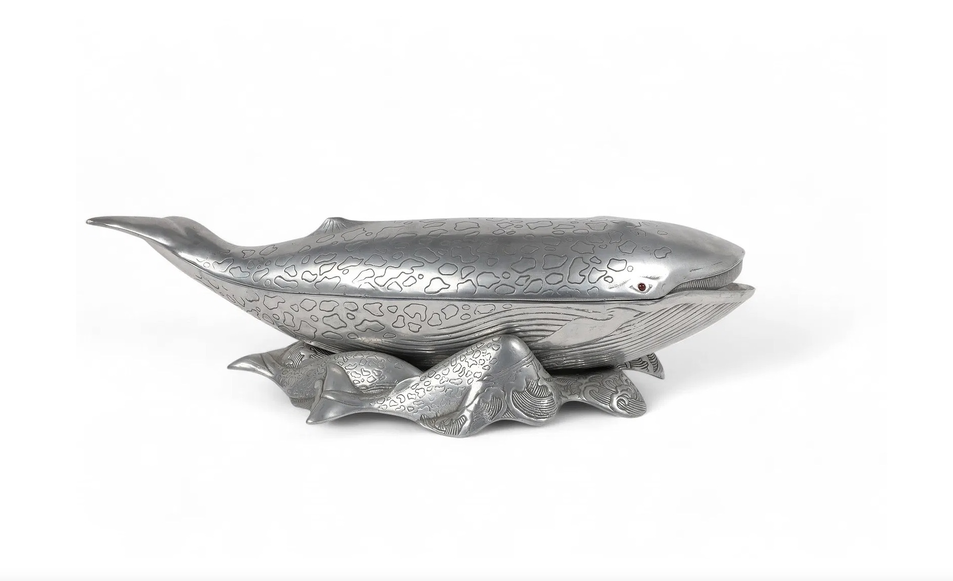 fitted with red cabochon eyes, the vintage Arthur Court aluminum whale-shaped ice bucket, wine cooler or tureen comprised of a base and cover; all resting on a matching stand consisting of swimming calves; stamped to underside; good vintage condition with overall even wear and patina.