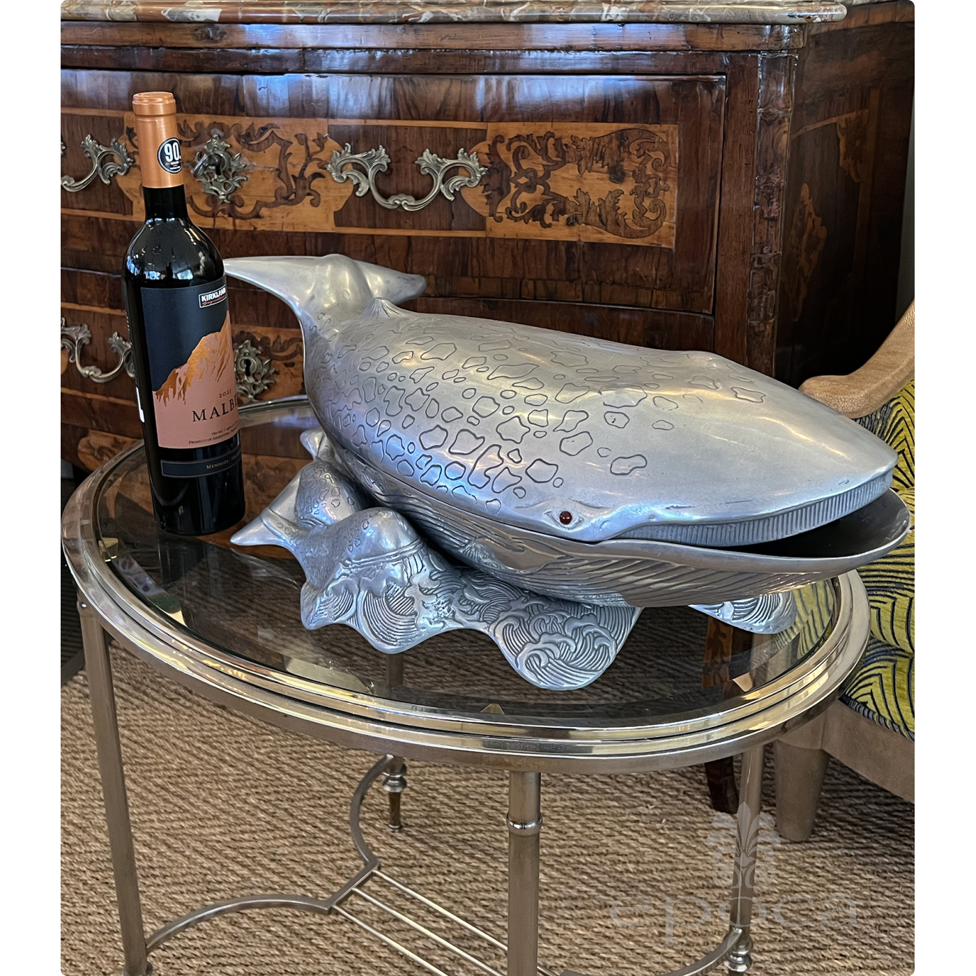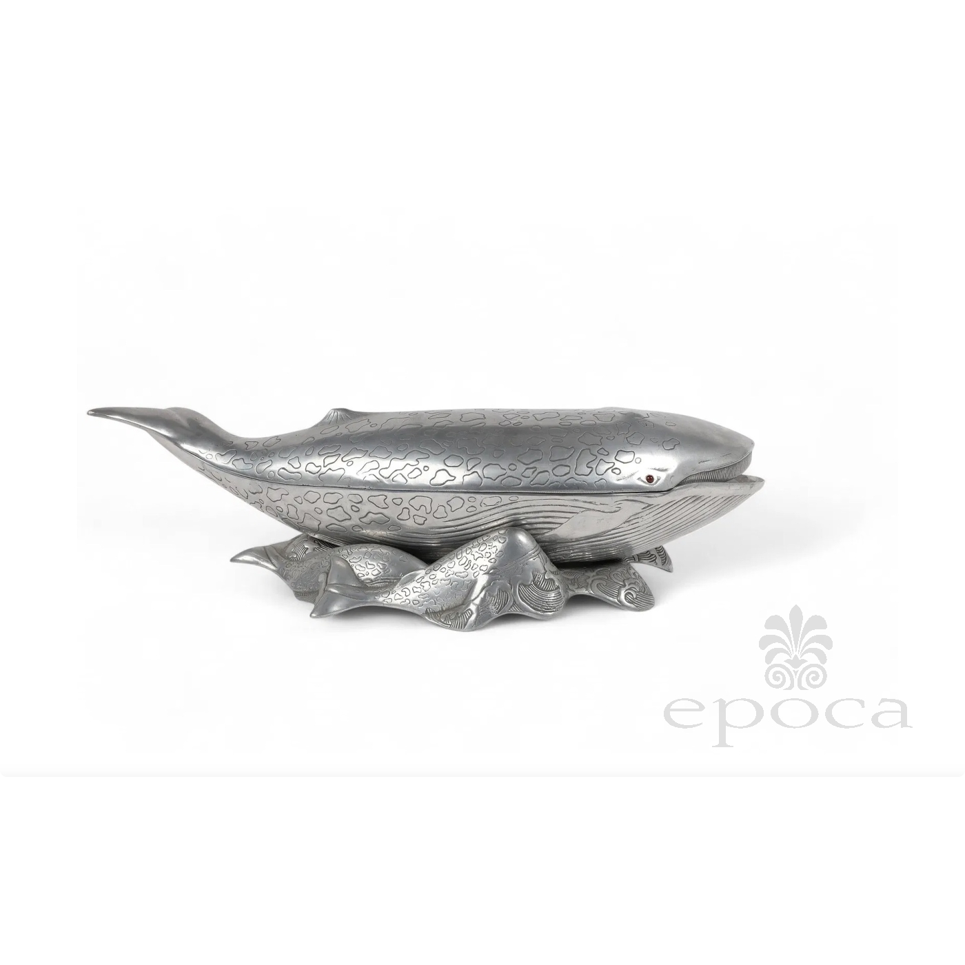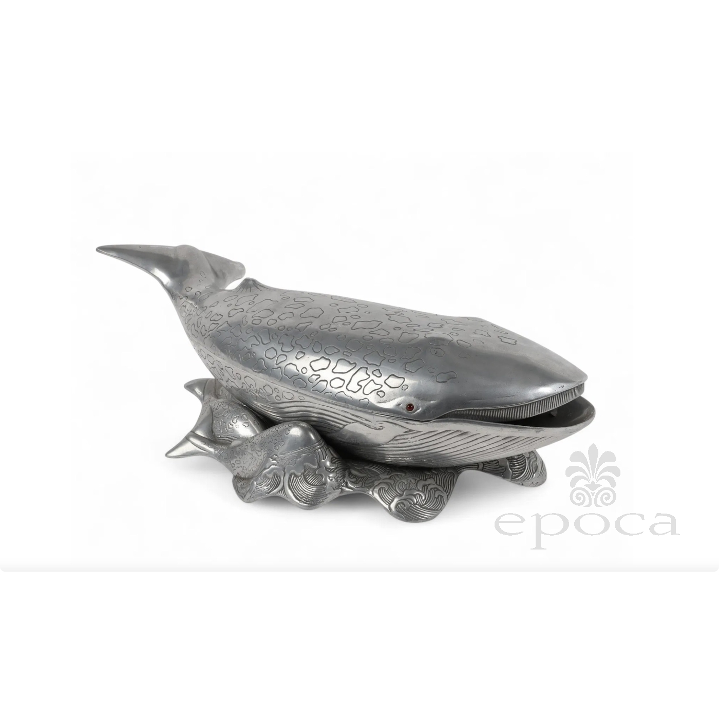 fitted with red cabochon eyes, the vintage Arthur Court aluminum whale-shaped ice bucket, wine cooler or tureen comprised of a base and cover; all resting on a matching stand consisting of swimming calves; stamped to underside; good vintage condition with overall even wear and patina.