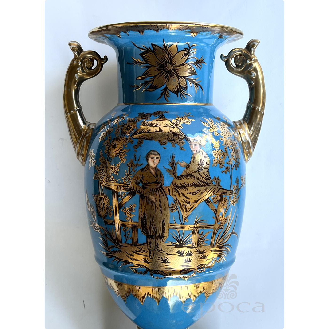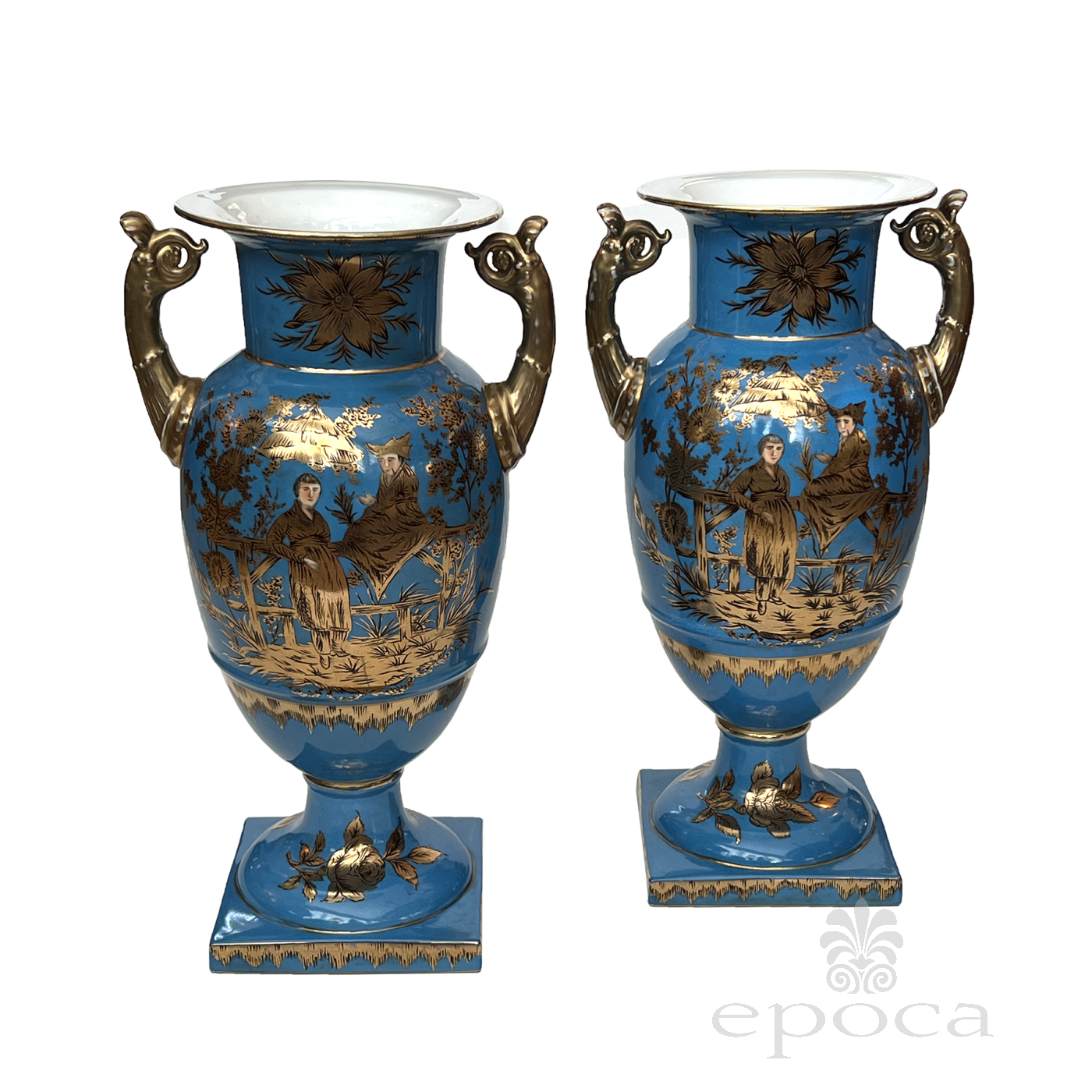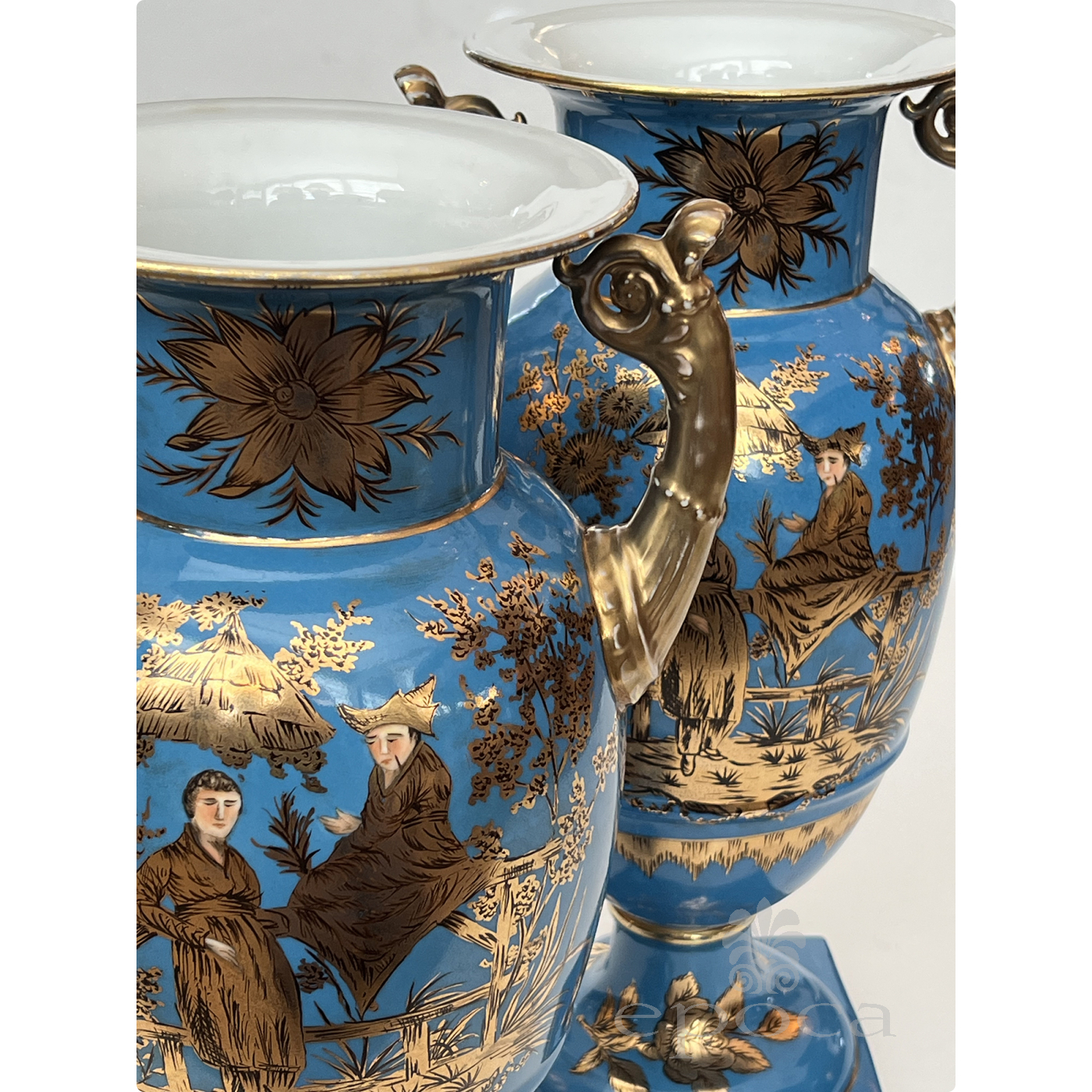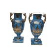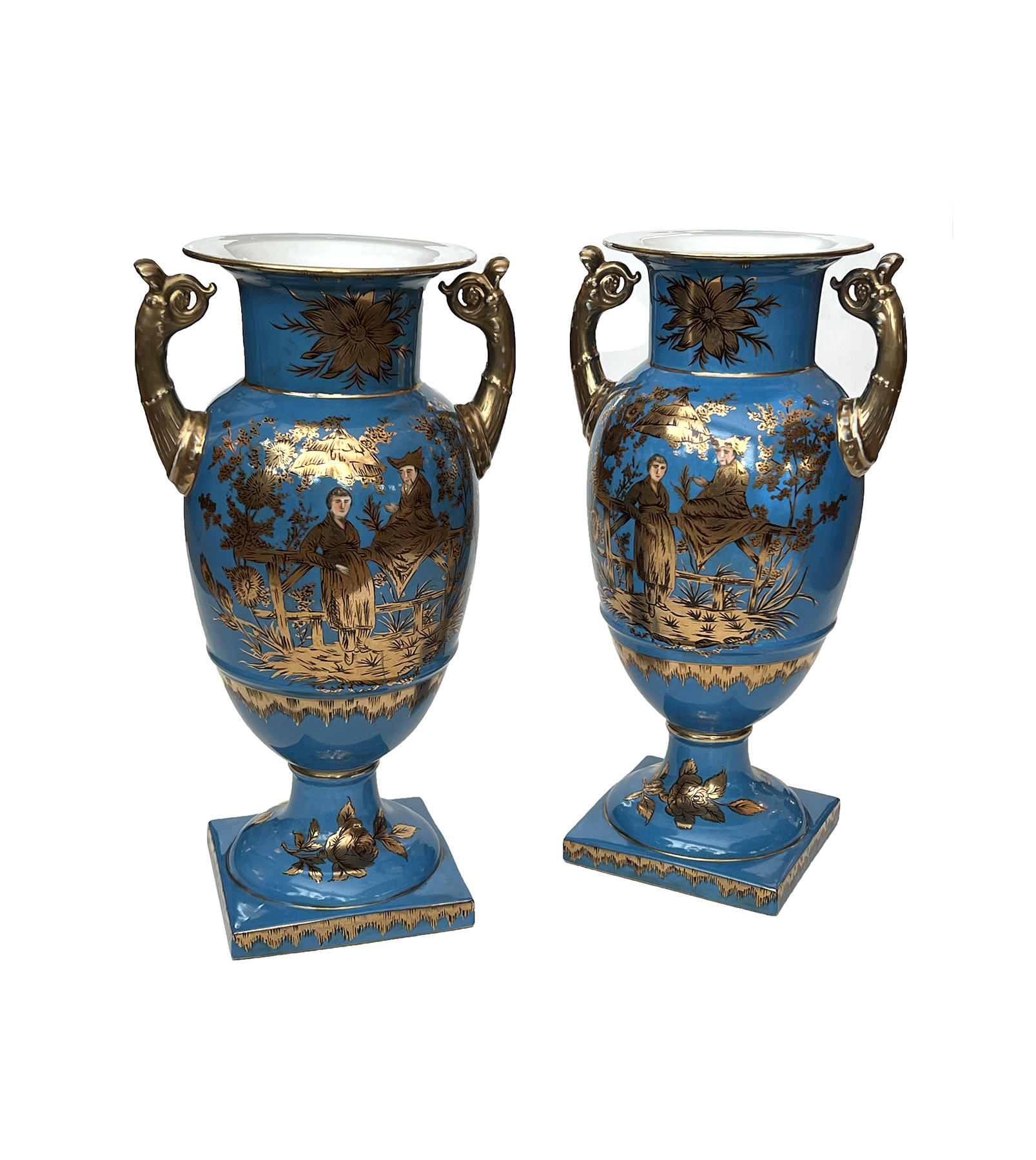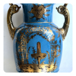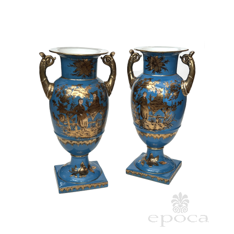 a large and elegant pair of Louis XVI Style urns with hand-painted gilt decoration depicting Chinese figures in a tranquil landscape setting; fitted with gilt pistol handles at the shoulders; with different landscape decoration on opposite side; good antique condition with no chips or cracks; minor overall wear to surface; rubbing to gilt handles