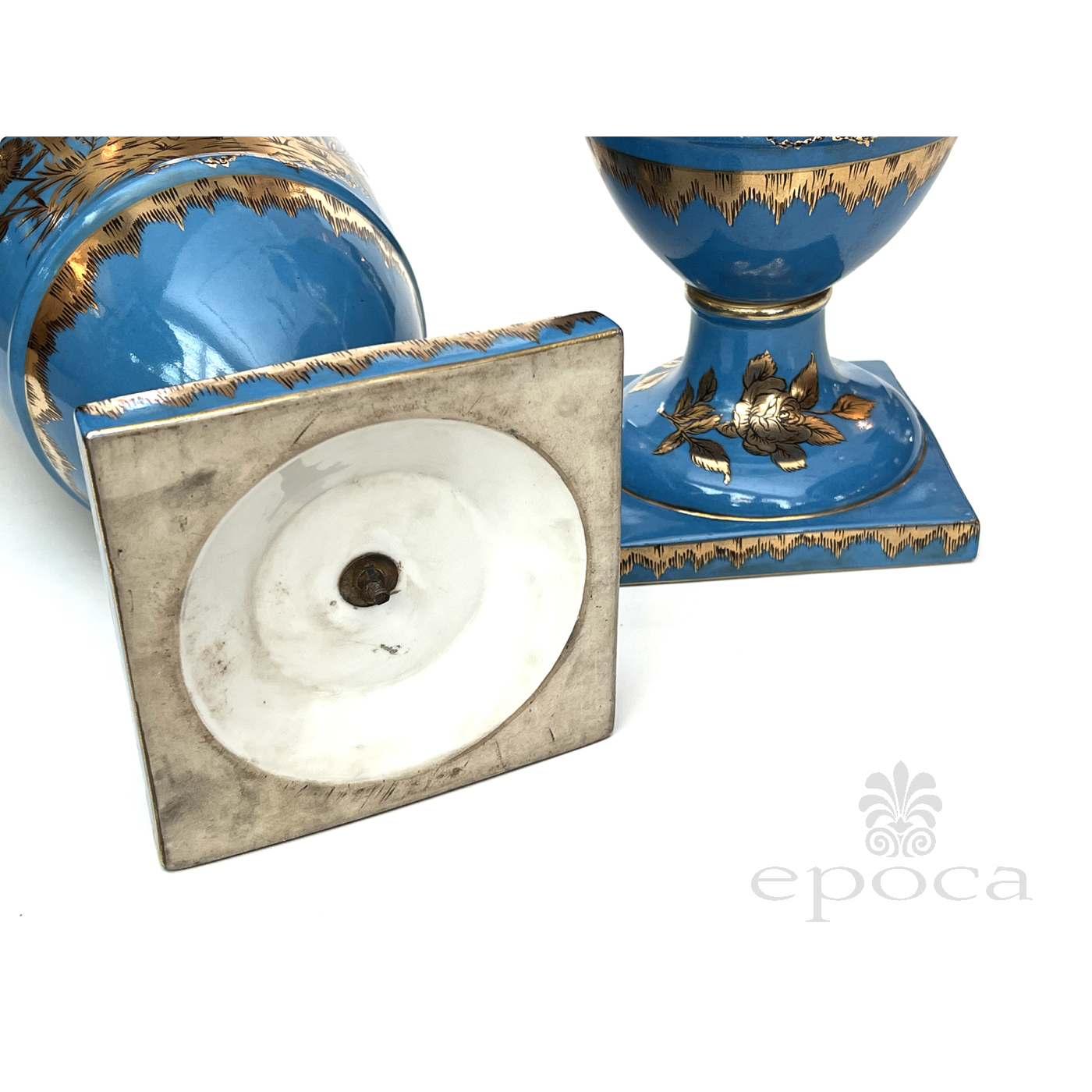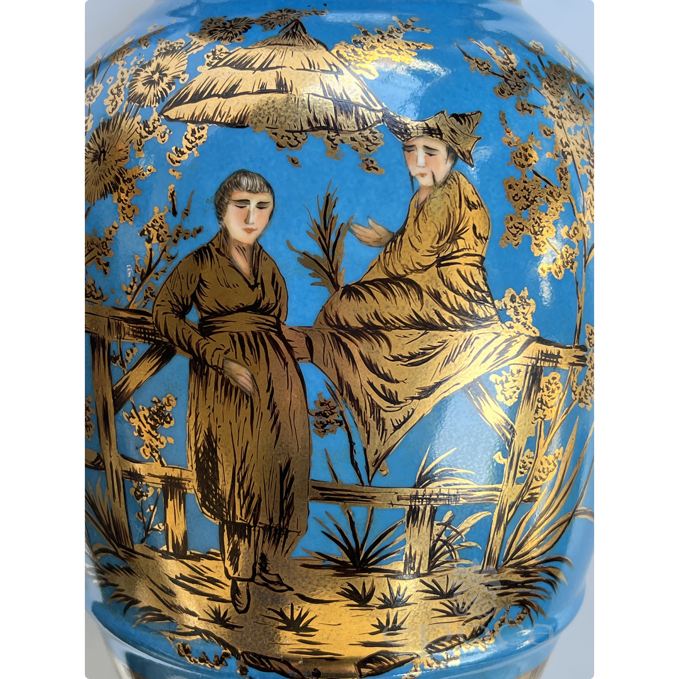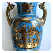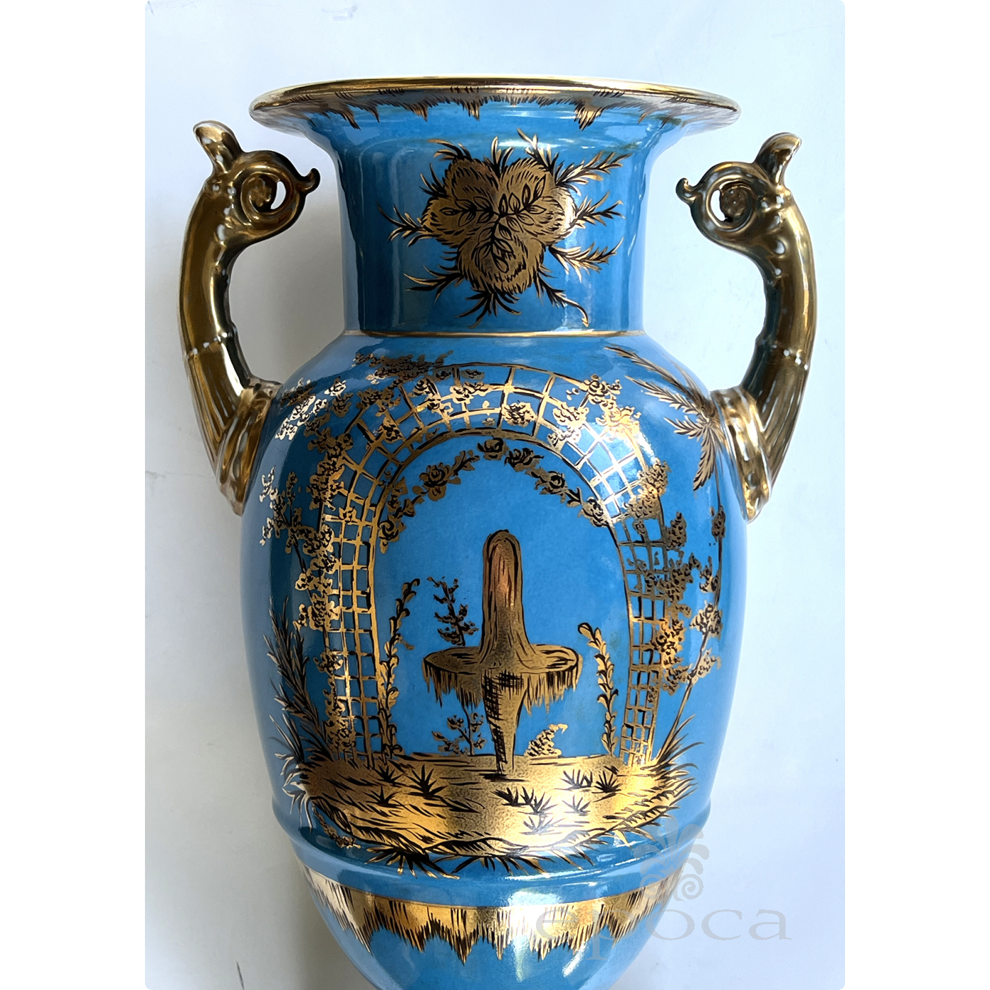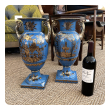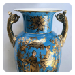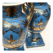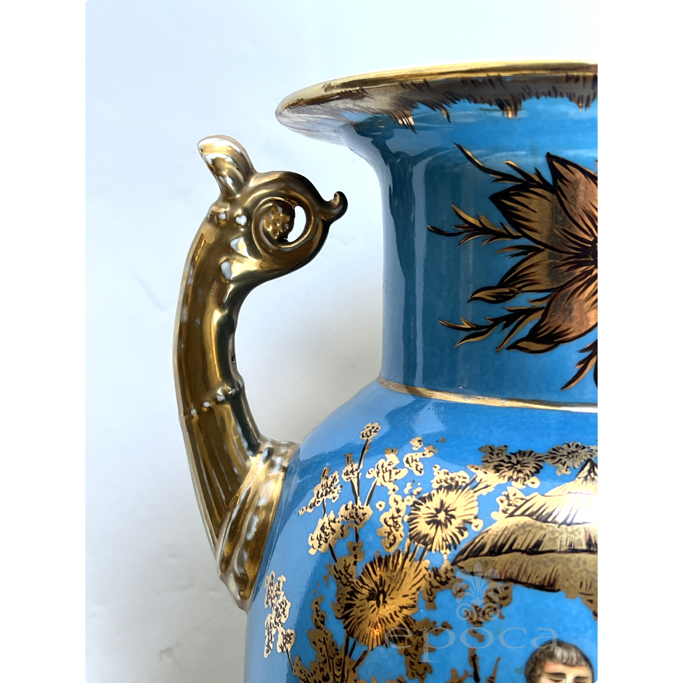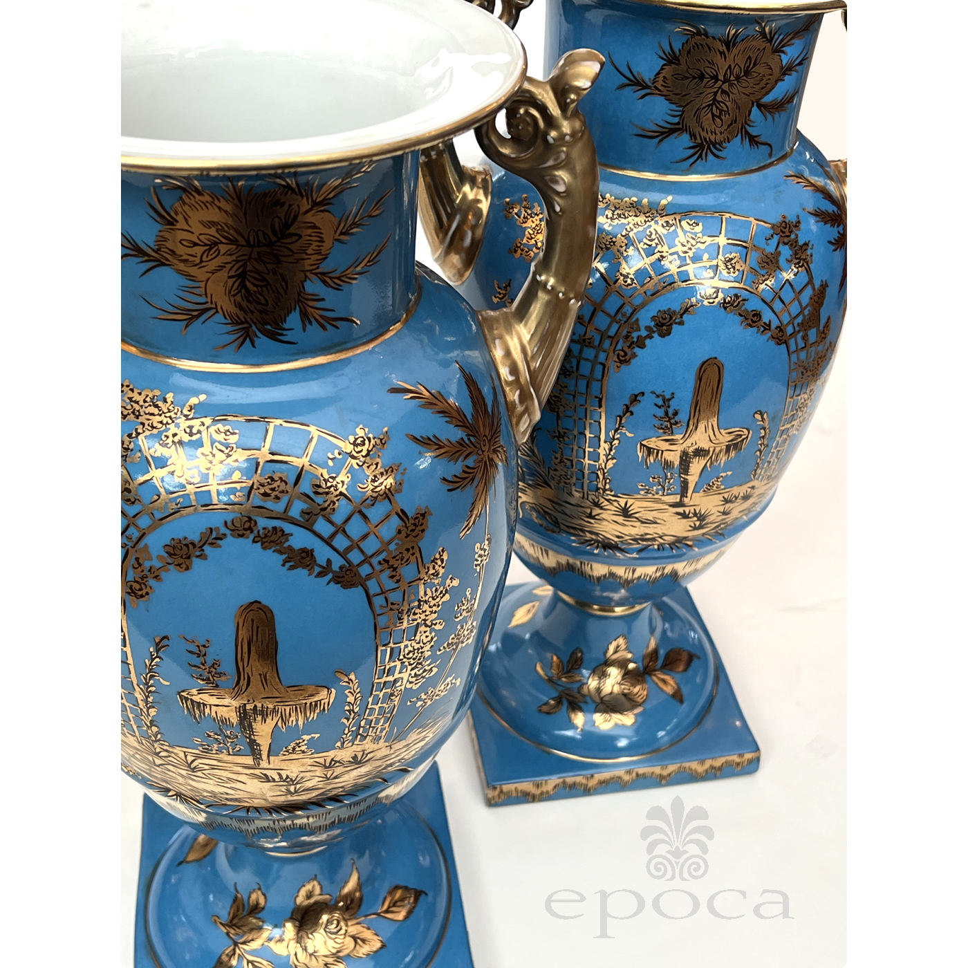a large and elegant pair of Louis XVI Style urns with hand-painted gilt decoration depicting Chinese figures in a tranquil landscape setting; fitted with gilt pistol handles at the shoulders; with different landscape decoration on opposite side; good antique condition with no chips or cracks; minor overall wear to surface; rubbing to gilt handles