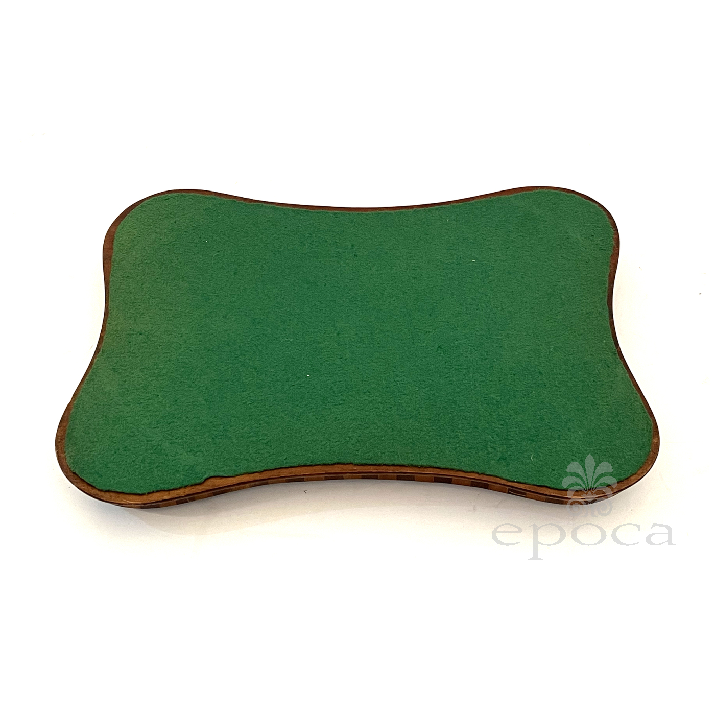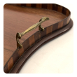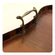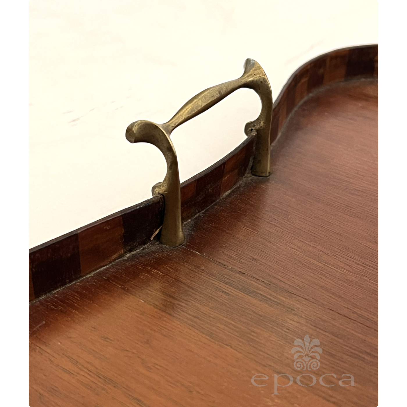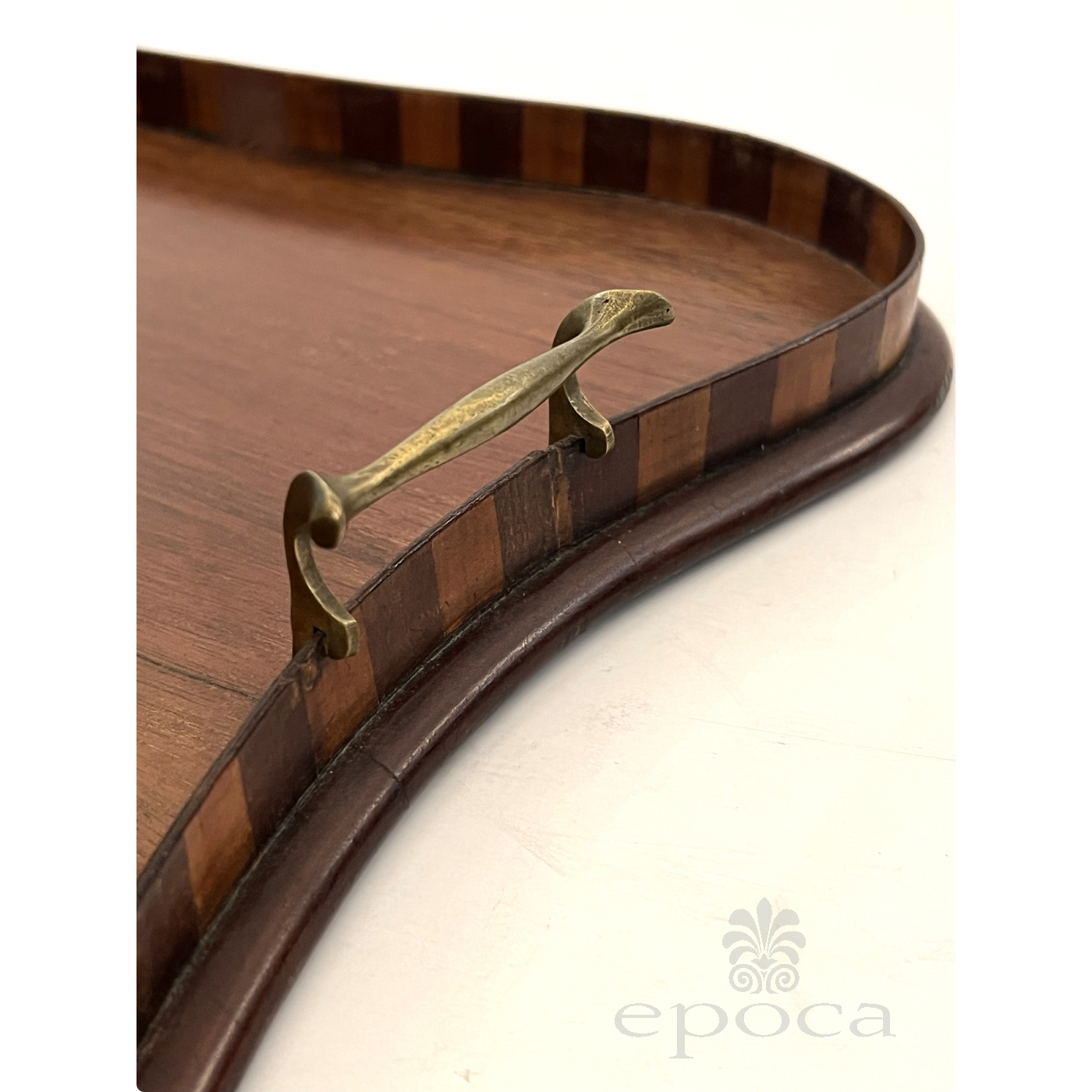 the shaped rectangular tray centering an inlaid conch medallion all within a conforming gallery of alternating mahogany and satinwood; the whole flanked by brass handles; with later baize material to underside; good antique condition with overall even wear and patina