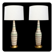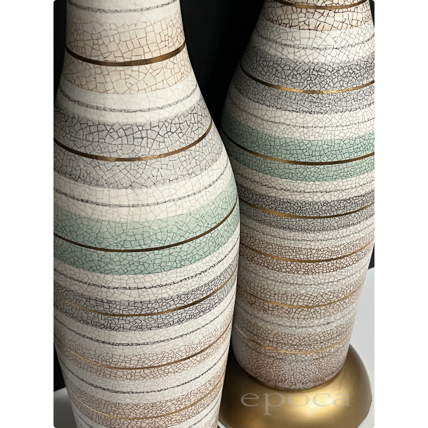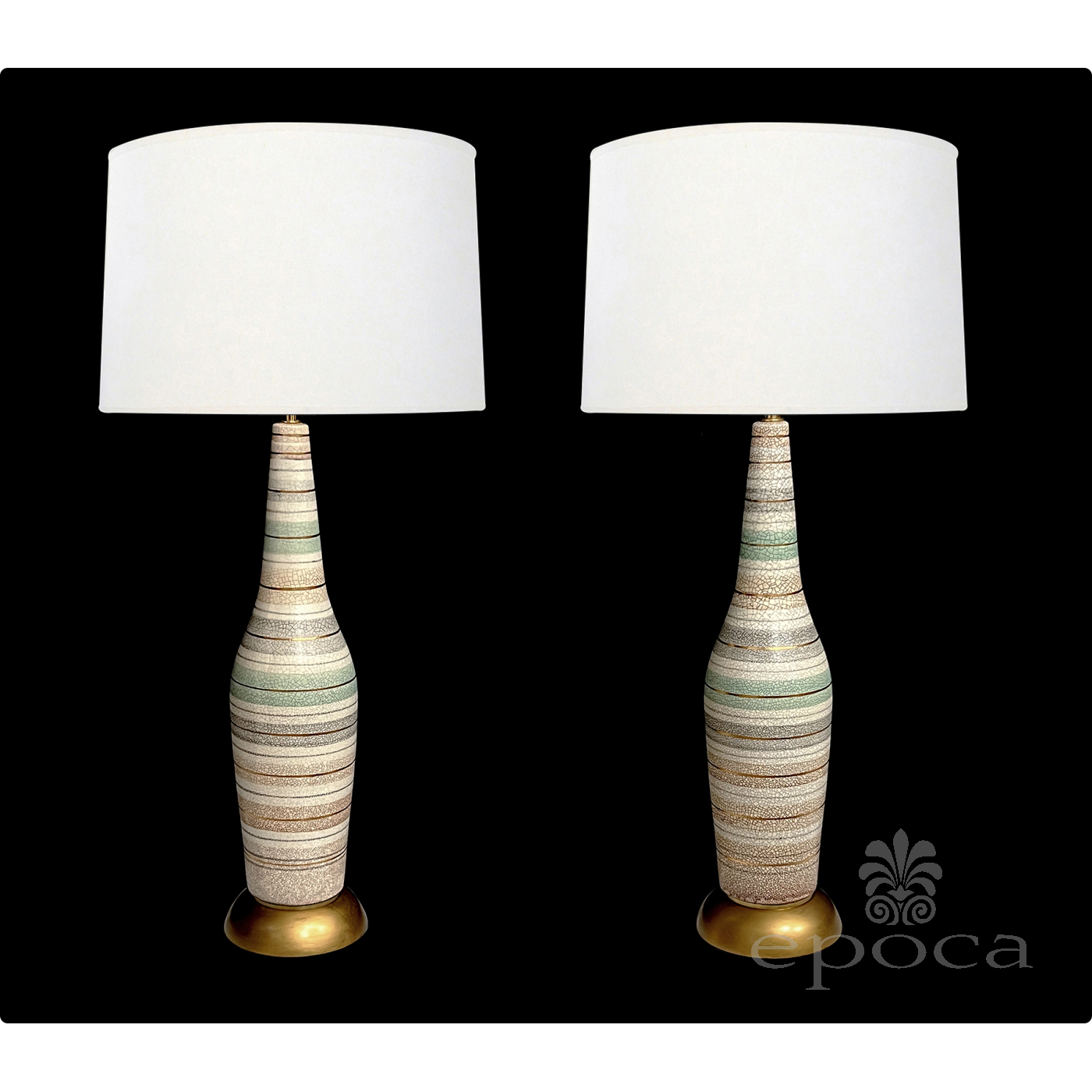 each tall lamp with long neck above a tapering body all in a crackle glaze finish with celadon, gray and buff stripes interspersed with gilt banding; all raised on gilt painted wooden bases; good overall condition with minimal wear; professionally rewired