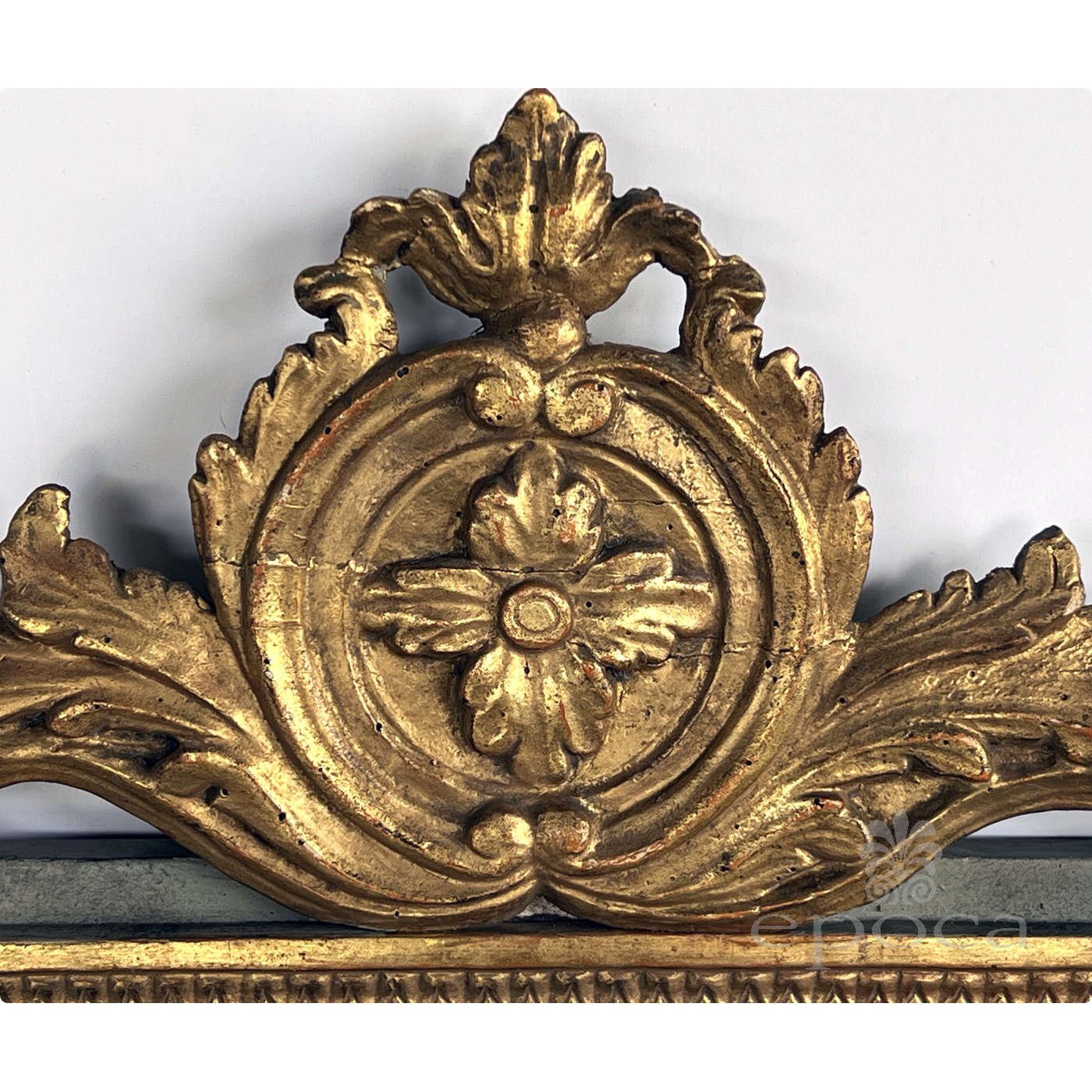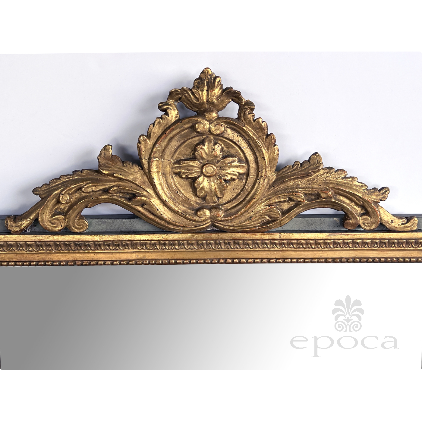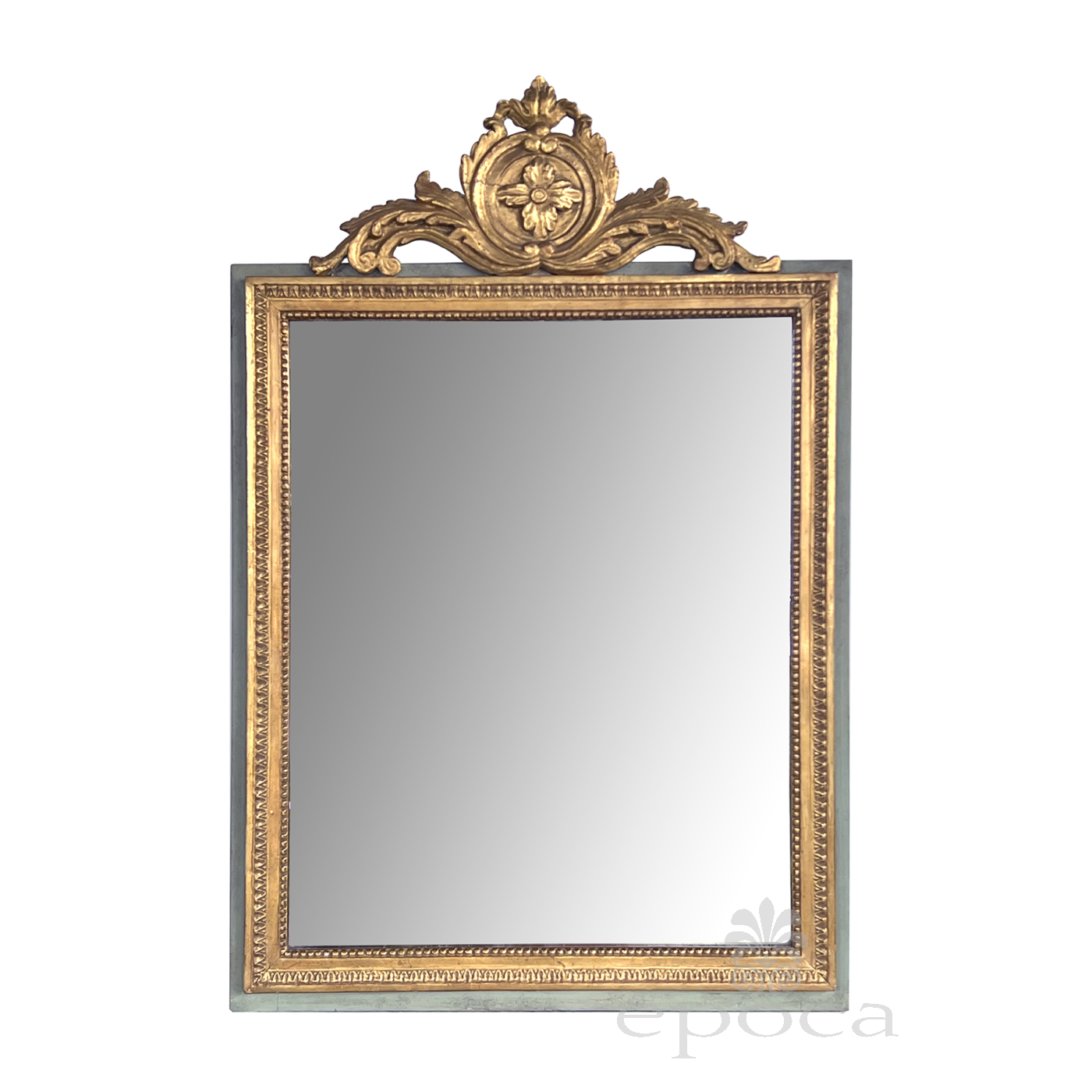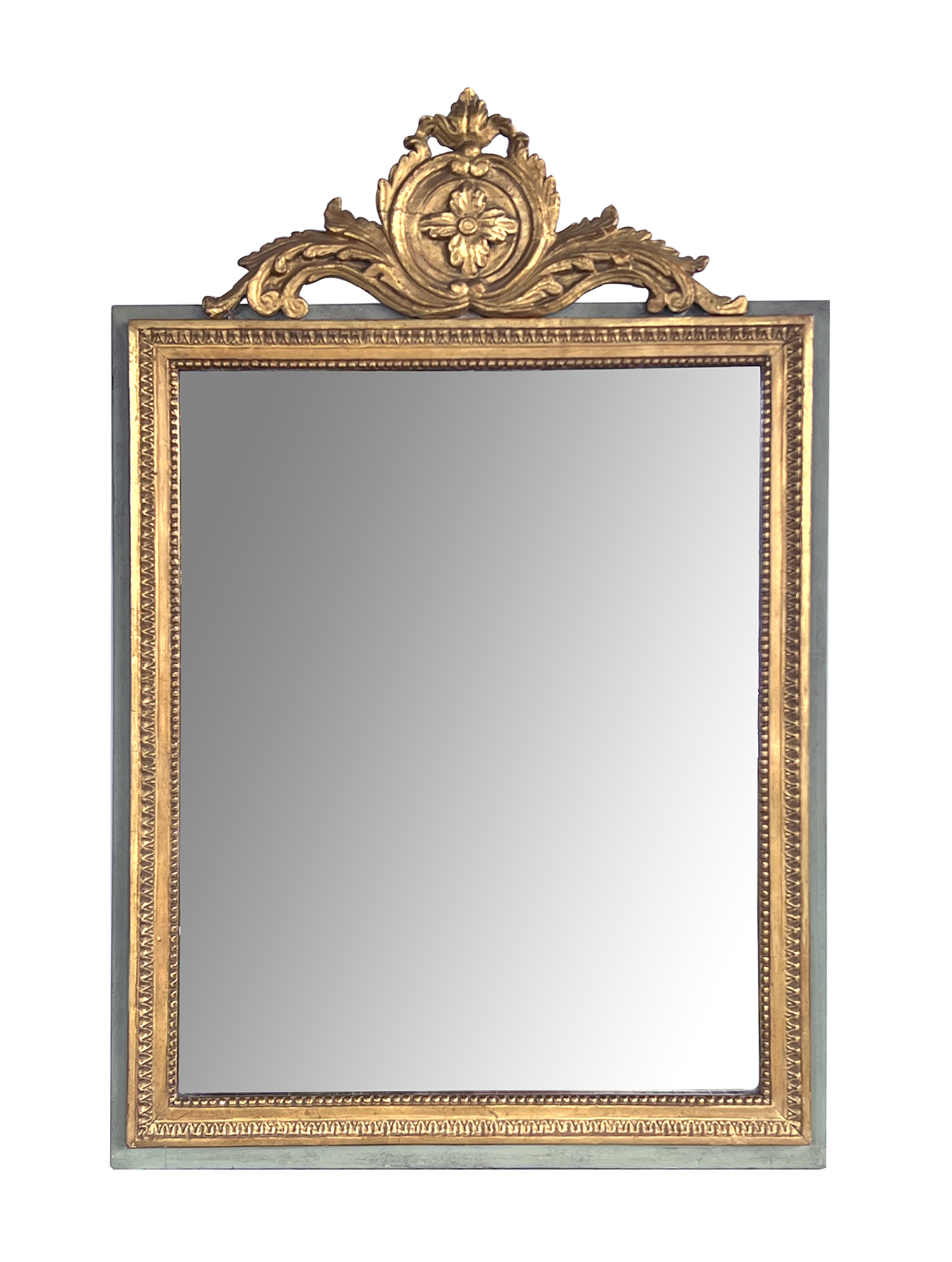 the rectangular mirror plate within a classically-inspired giltwood frame with beaded slip and leaf band outer edge all framed by an aqua painted border; the whole surmounted by a lively carved crest centering a foliate medallion flanked by scrolled acanthus leaves; with paper 'Borghese' label adhered to back; professionally refreshed surface with overall even wear and patina; some loss to silvering