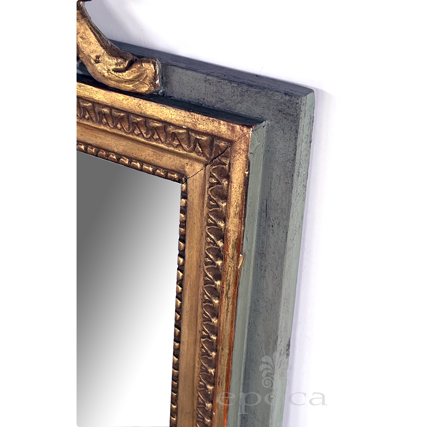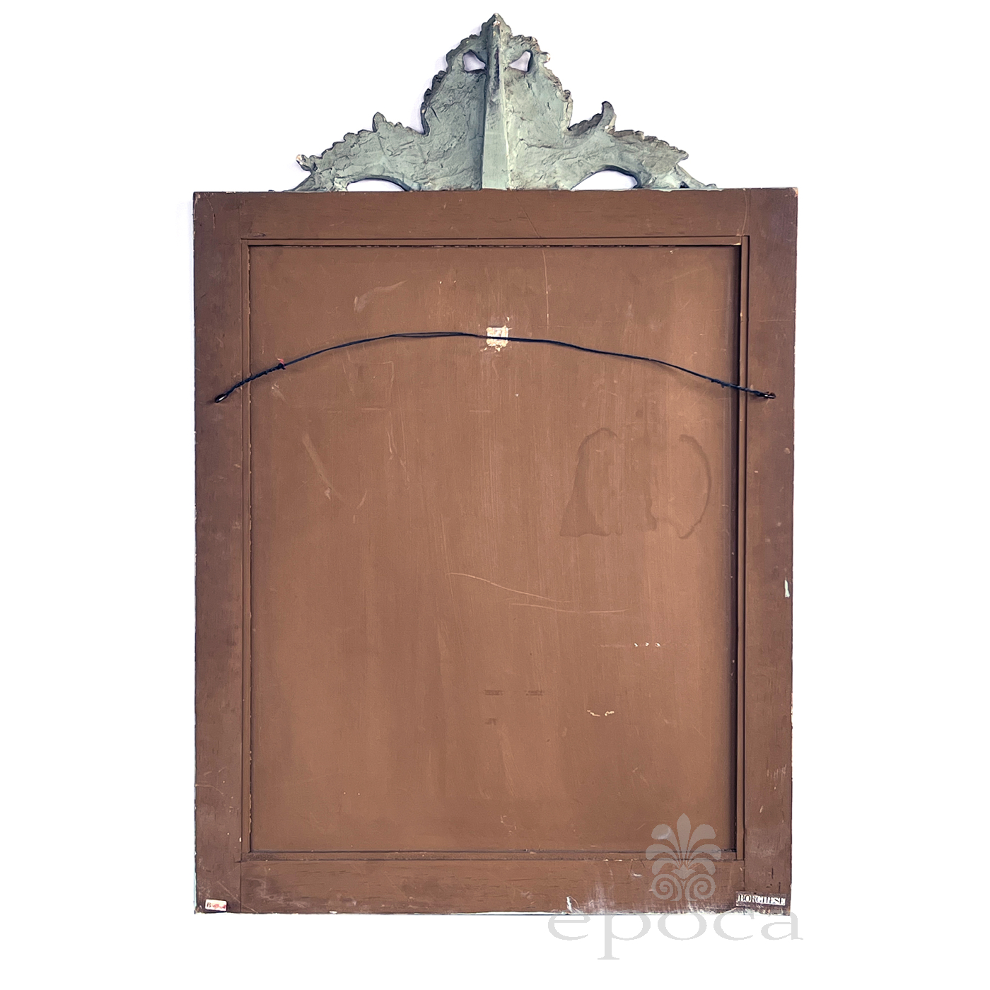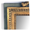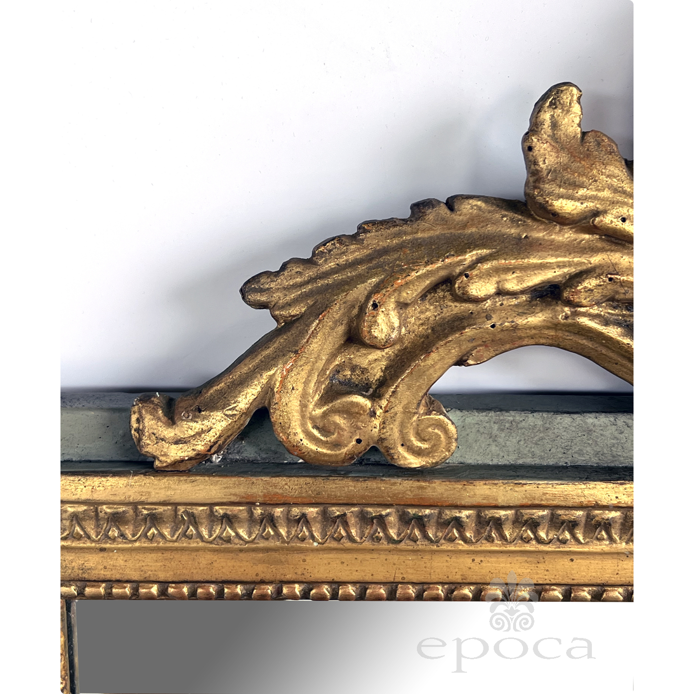 the rectangular mirror plate within a classically-inspired giltwood frame with beaded slip and leaf band outer edge all framed by an aqua painted border; the whole surmounted by a lively carved crest centering a foliate medallion flanked by scrolled acanthus leaves; with paper 'Borghese' label adhered to back; professionally refreshed surface with overall even wear and patina; some loss to silvering