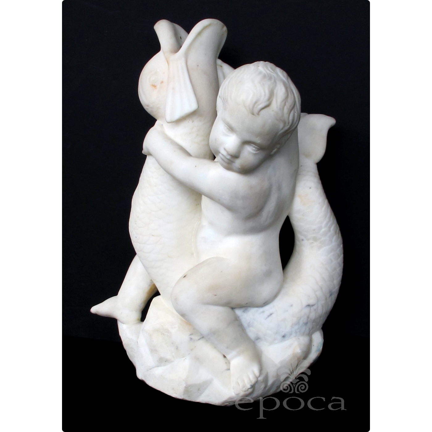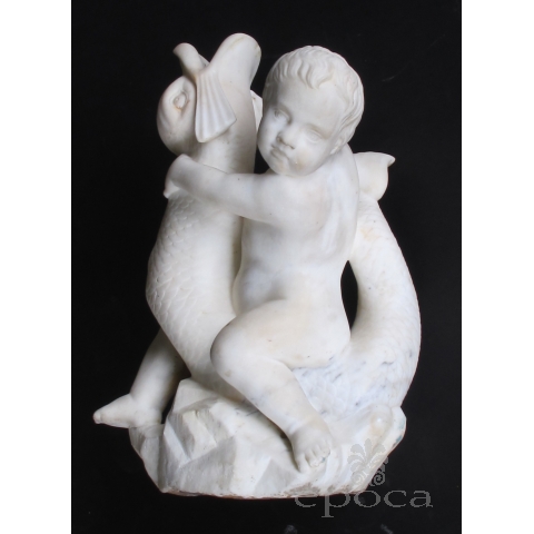 the playful chubby putti with head turned holding onto a writhing dolphin; overall even weathering; excellent condition.