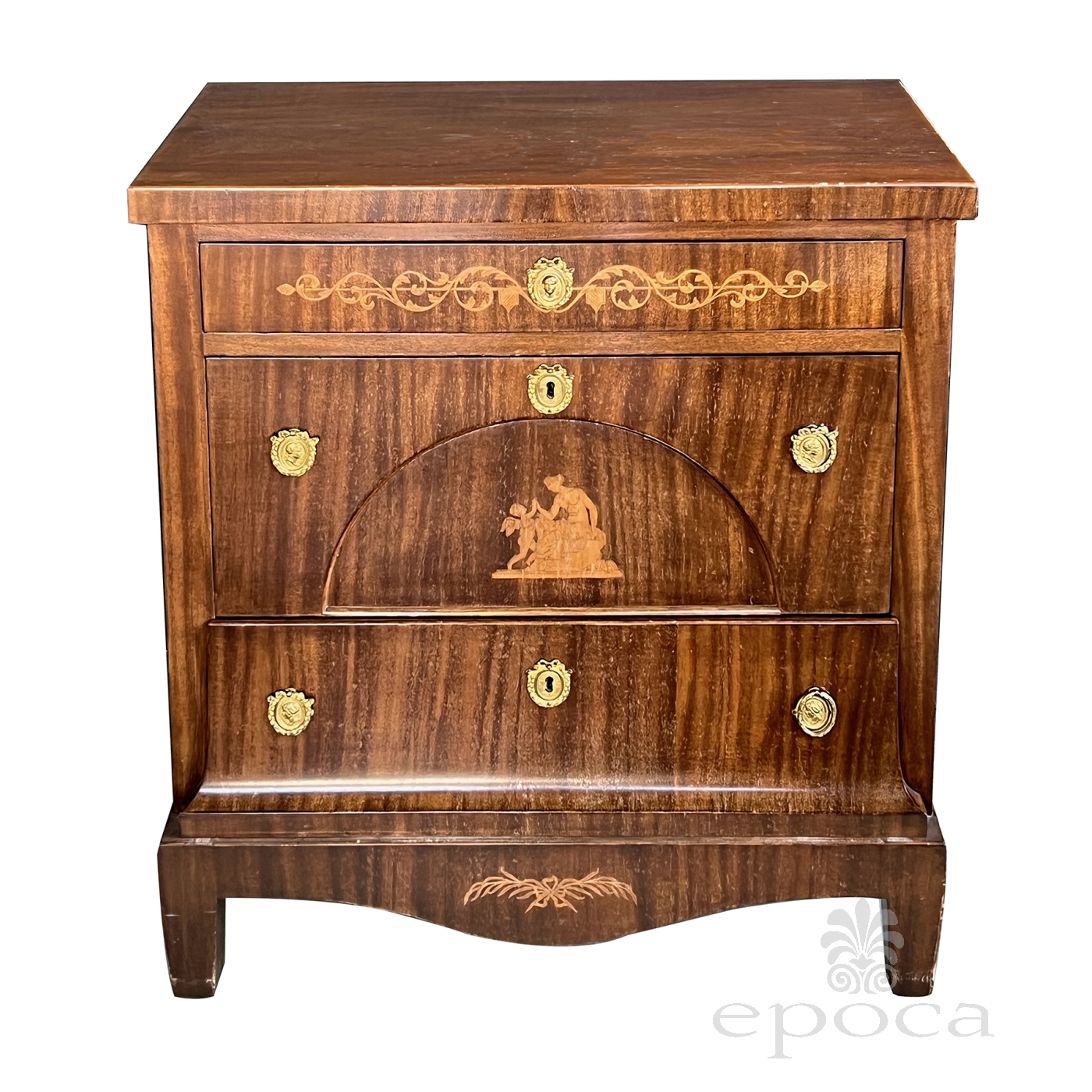 the handsome chest constructed during the Golden Age of Danish furniture (1800-1850) and composed of well-figured mahogany veneer fitted with three drawers inlaid with neoclassical decoration all over a scalloped apron and raised on tapering quadrangular supports; good antique condition with minor veneer repairs and overall even wear and patina