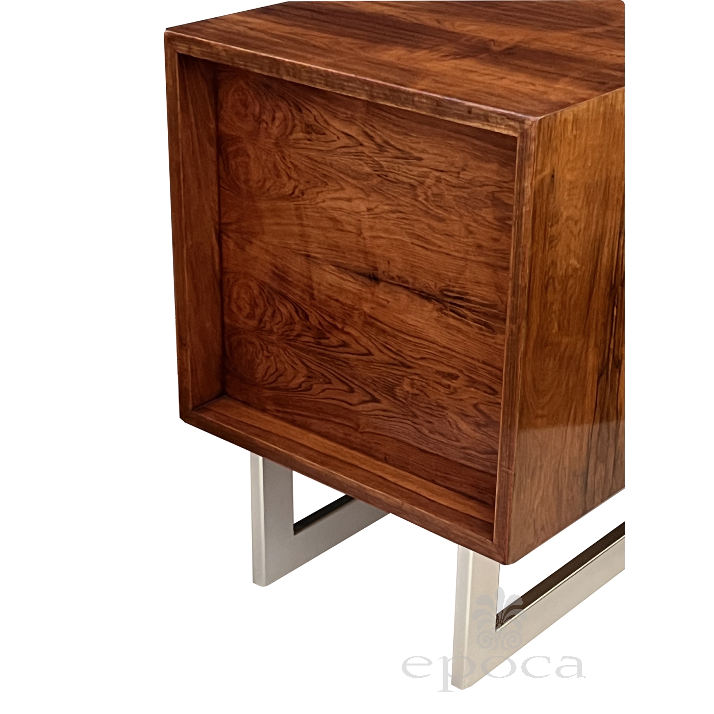 designed in 1959 by Bodil Kjær to accompany her iconic ‘James Bond’ desk in a well-figured and deeply patinated rosewood; manufacrtured by E. Pedersen & Søn for Jason Møbler; fitted with one filing drawer and one smaller drawer all supported on steel supports; good vintage condition with professionally restored finish; key plate removed and filled