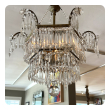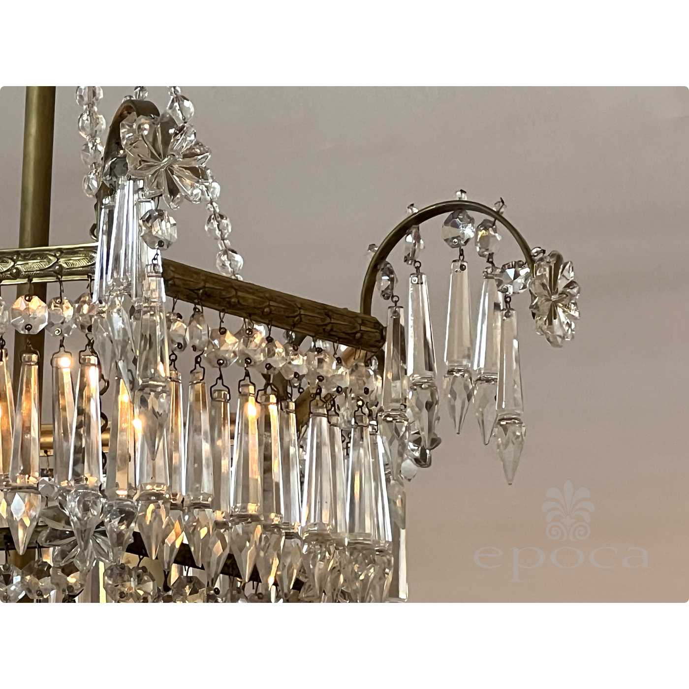 the elegant fixture is reminiscent of the grandeur and elegance of the French Empire style with a hexagonal, tiered gilt-bronze frame hanging from a central support adorned overall with crystal drops ending in a large, faceted crystal ball suspended from the center; the top tier with neoclassical detailing of overlapping laurel leaves and berries; fitted with a 3-light cluster for chandelier base bulbs (maximum 60 watts per socket); good antique condition with even patina; professionally rewired.