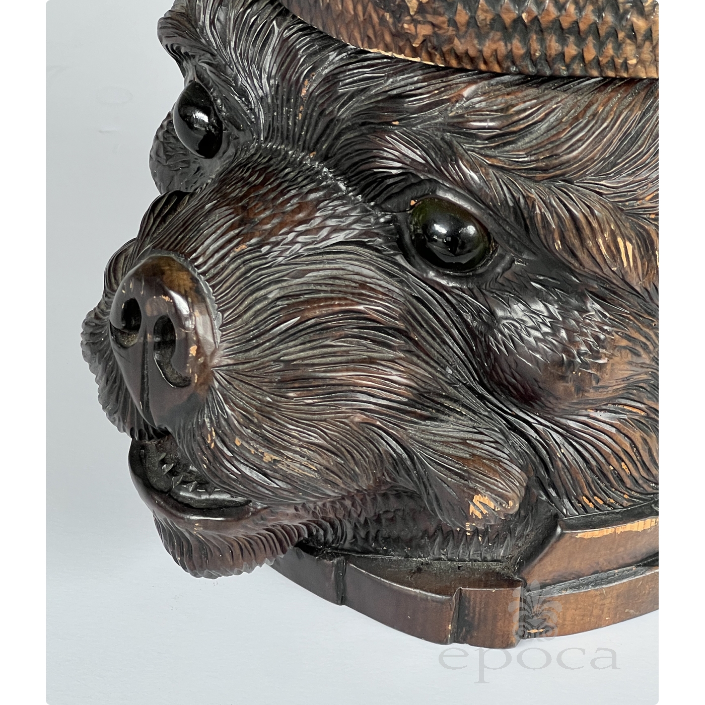 Of large scale, the well-delineated and intricately carved head of a bear with hat motif lid; the expressive face with glass eyes and large snout; most likely from the Black forest area in the Swiss city of Interlagen; good antique condition with overall even wear and patina