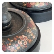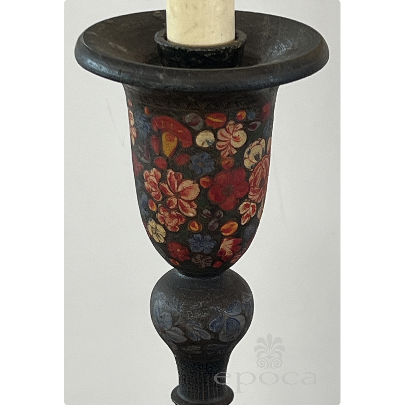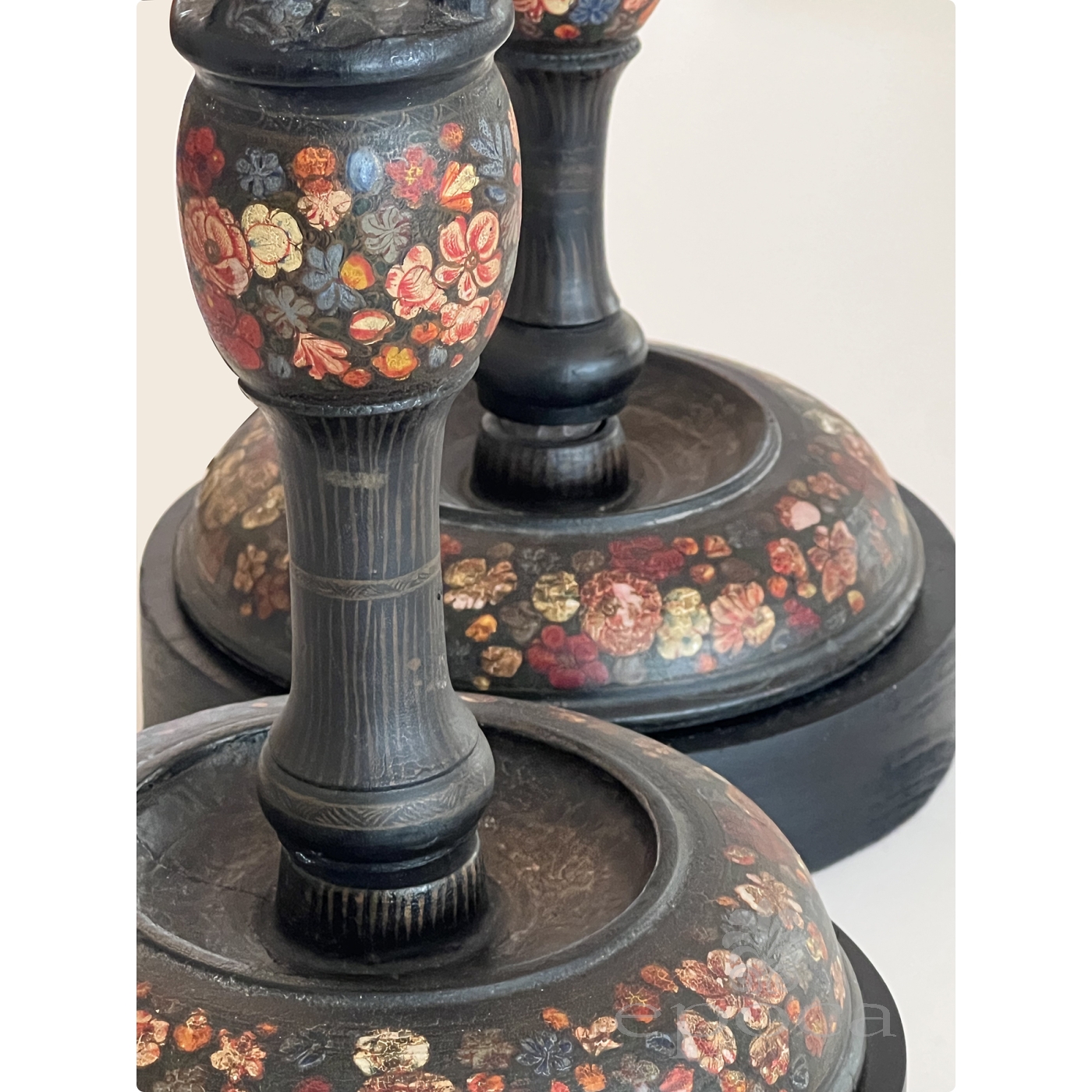 tall pair of Kashmir polychrome and black lacquer candlesticks now electrified; each twisting openwork stick surmounted by a candle cup issuing an electrified socket all raised on a round foot over a later ebonized wooden plinth; adorned overall with colorfully painted floral decoration; good antique condition with overall even wear and patina; professionally rewired; one foot with old stable split