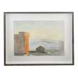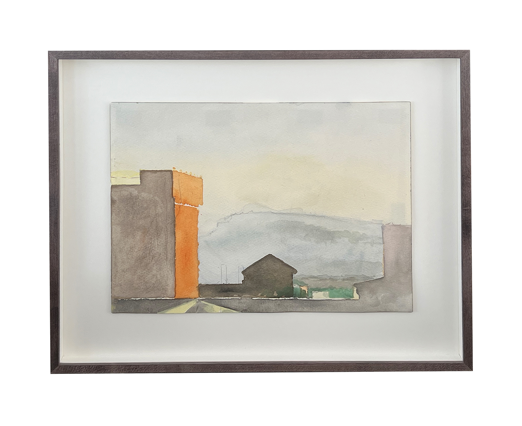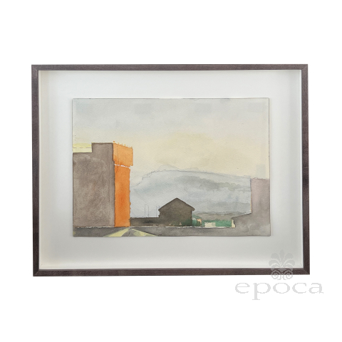 During the early 1980s, the artist worked from his Potrero Hill Studio and ventured to Dog Patch quite often. He was taken by the rolling fog that crept over Potrero Hill and depicted it in a series of small paintings looking west over the warehouses of Dog Patch towards the hills; now float mounted on a matting board all under glass within an ash frame; signed on verso