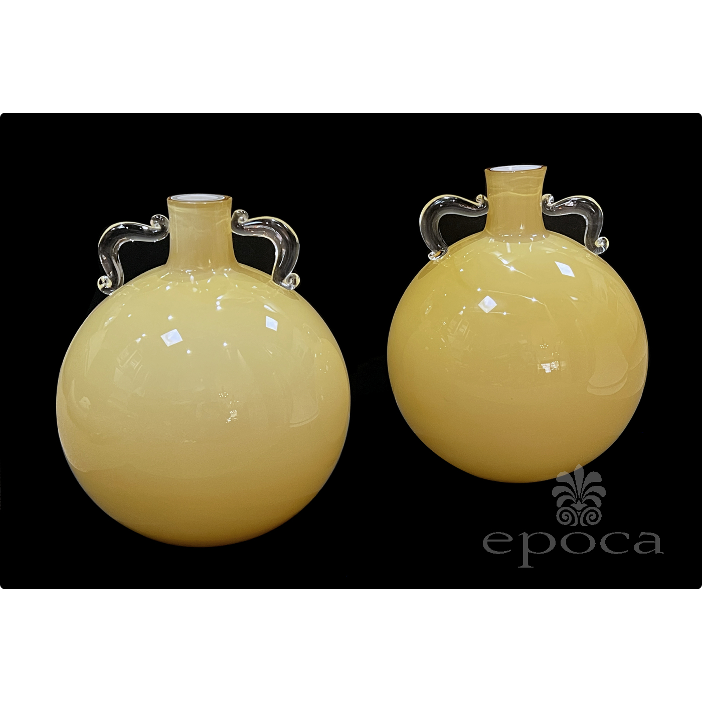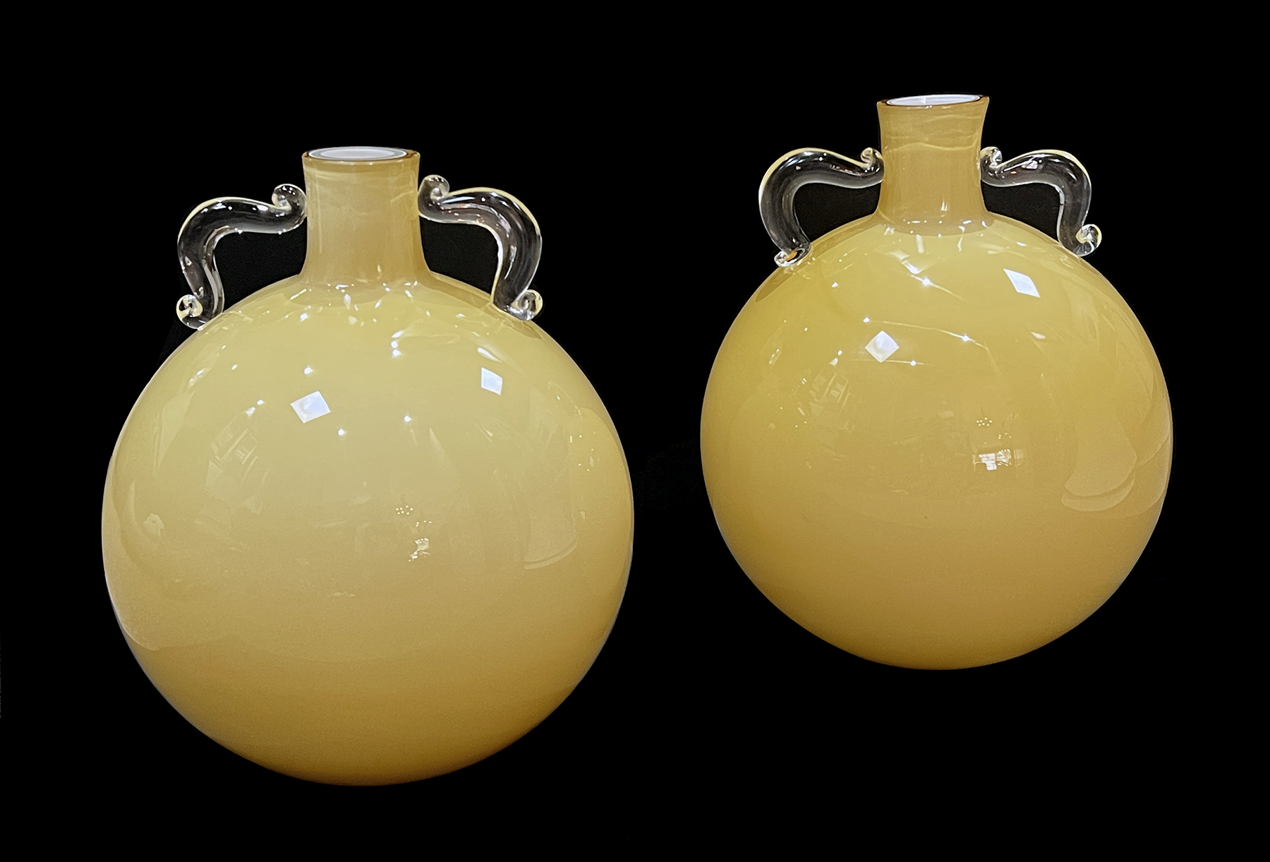 each exceptionally large hand-blown vessel with short neck flanked by clear double handles over a large spheroid body; designed by world renowned Hall of Fame interior designer Sally Sirkin Lewis exclusively for J. Robert Scott Furniture; acid etched maker's mark to underside of each "SS L" (Sally Sirkin Lewis); no longer in production; good condition with only minor wear; slight variation in color saturation due to their hand-crafted nature
