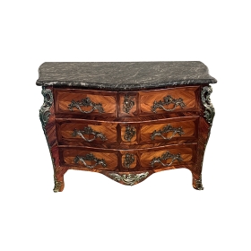 this Impressive 18th Century French Régence Ormolu-mounted rosewood-veneered commode signed 'JB Hedouin' Master Cabinetmaker, Paris; featuring a bombé-form body fitted with four drawers of herringbone parquetry inlay with oak secondary structure; retaining its original ormolu and hardware all of grand scale and typical of the rocaille period; the original 1938 Catalog Label on reverse; professionally restored with some veneer replacements; French polished and bronze lightly cleaned; good antique condition; later Gris St. Anne marble top.