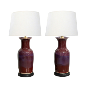 each large and richly glazed vase of baluster form with wiped rim and base featuring striated and speckled oxblood glazed body with deep lavender/blue overtones; now drilled and mounted as lamps with ebonized wooden bases; in overall good condition with minor surface rubbing and wear commensurate with age and use