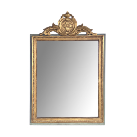 the rectangular mirror plate within a classically-inspired giltwood frame with beaded slip and leaf band outer edge all framed by an aqua painted border; the whole surmounted by a lively carved crest centering a foliate medallion flanked by scrolled acanthus leaves; with paper 'Borghese' label adhered to back; professionally refreshed surface with overall even wear and patina; some loss to silvering