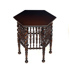 the deeply patinated occasional table with hexagonal top above an intricately carved openwork body of barley twist supports all raised on turned legs; professionally refinished; frame re-glued and strengthened