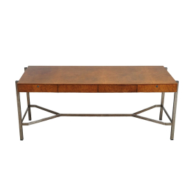 designed by Jack Friedin (American 1930-2004) for Pace Furniture, the rectangular top above an apron fitted with four flush drawers all in a well-figured burlwood veneer; raised on a polished steel frame; good vintage condition; professionally refinished with small areas of replaced veneer