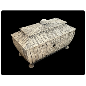 the Vizagapatam casket-form tea caddy in the Regency taste, the exterior veneered with sections of antlers, with a carved knob and bun feet; the hinged lid opens to reveal an interior fitted with a pair of tea compartments with hinged covers, the fittings decorated with penwork detailing; good antique condition; mixing bowl now lacking; working key and lock