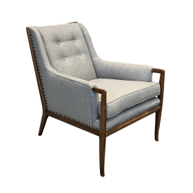 of classic Robsjohn-Gibbings design with its iconic profile featuring a framed upholstered back above a loose cushion seat flanked by open work arms; all raised on subtly flared supports; warm patina to well-figured walnut frame; professionally refinished; good sturdy condition; in need of reupholstering.