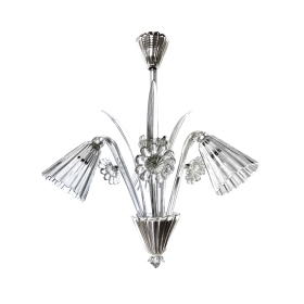 the mid-century Murano chandelier of shimmering clear glass having a central glass post supporting a ribbed canopy; all over a scalloped bowl ending in a floral pendant; the bowl emanating three downward-facing ribbed conical shades fitted with standard sockets; featuring three large sunflower stems, three floral stems and three curved leaves; excellent condition with no chips or cracks; no missing elements; professionally rewired