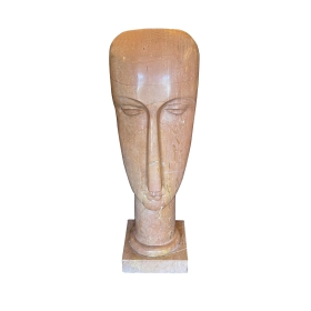 characterized by its simplified, geometric forms, elongated facial features, and mask-like appearance it features stylized marquis-shaped eyes, a prominent nose forming a blade-like shape, and a small mouth, all over a long, cylindrical neck and square plinth; finely carved and finished from a block of rosso allicante marble; overall even wear with chipping to base