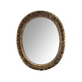 the finely carved frame encircled by a floral and foliate garland in high relief all surrounding the original mercury plate; overall even wear and patina; age and antiquing to mirror plate