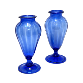 an elegant and antique pair of hand-blown Murano trumpet or amphora vases having a defined rolled lip above a tapering body with vertical optic stripe all raised on a waisted foot and flared circular base; pontil scar to underside; due to their handmade nature, there are asymmetries, bubbles, lines and variations in color; good antique condition with no chips or cracks